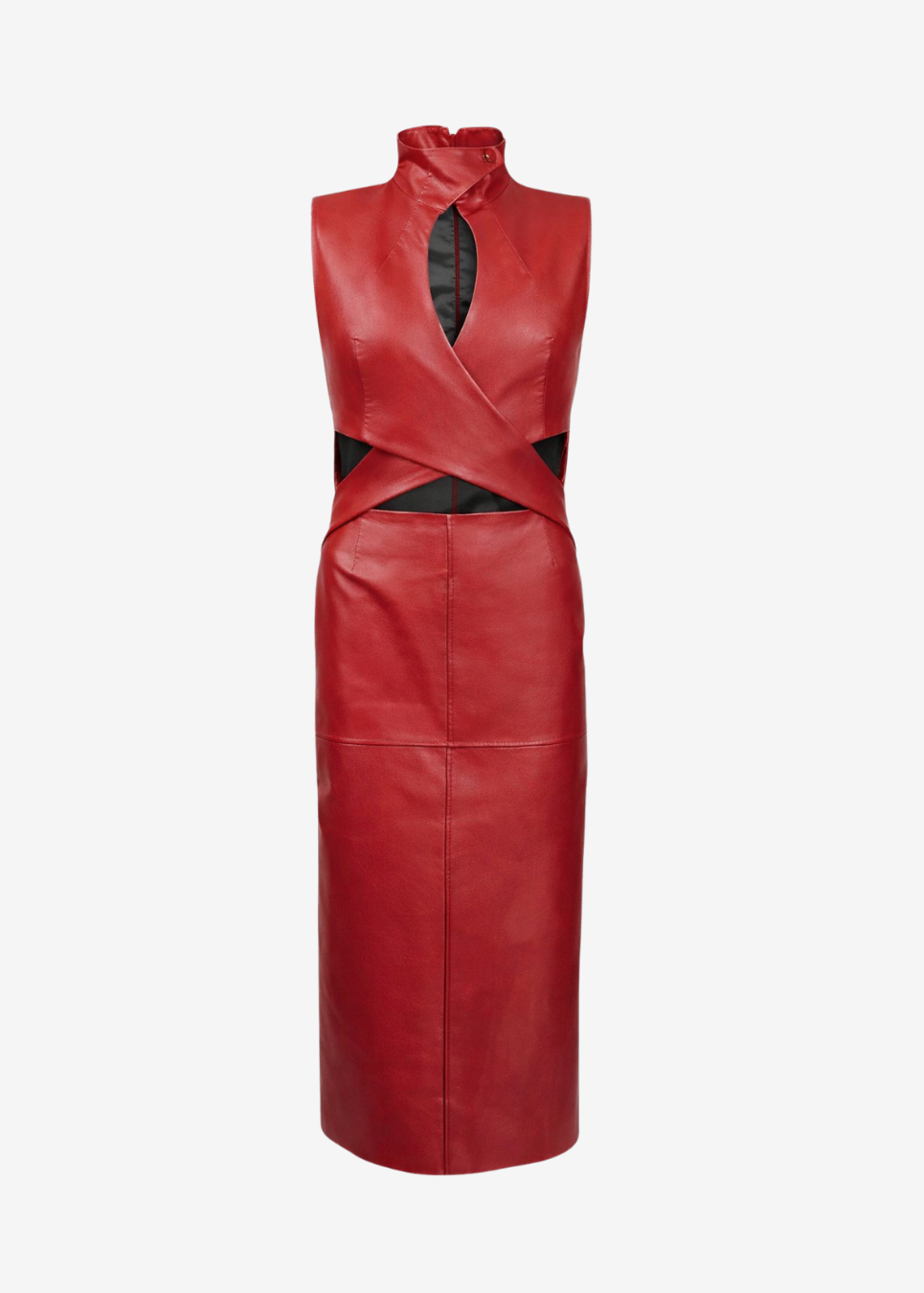 Sleeveless turtleneck dress with cutouts on the front and waist.