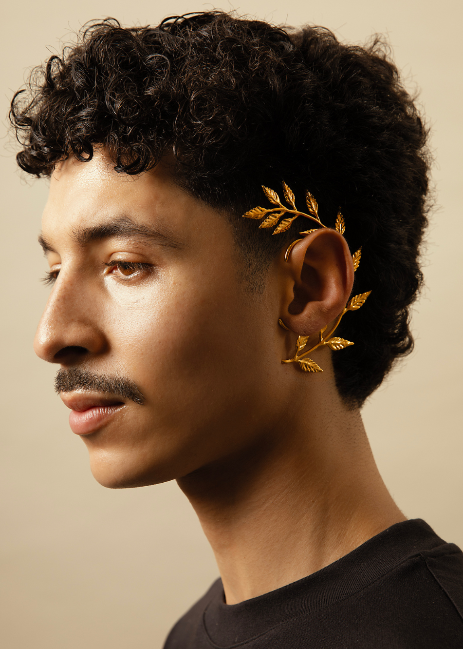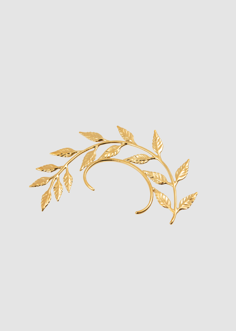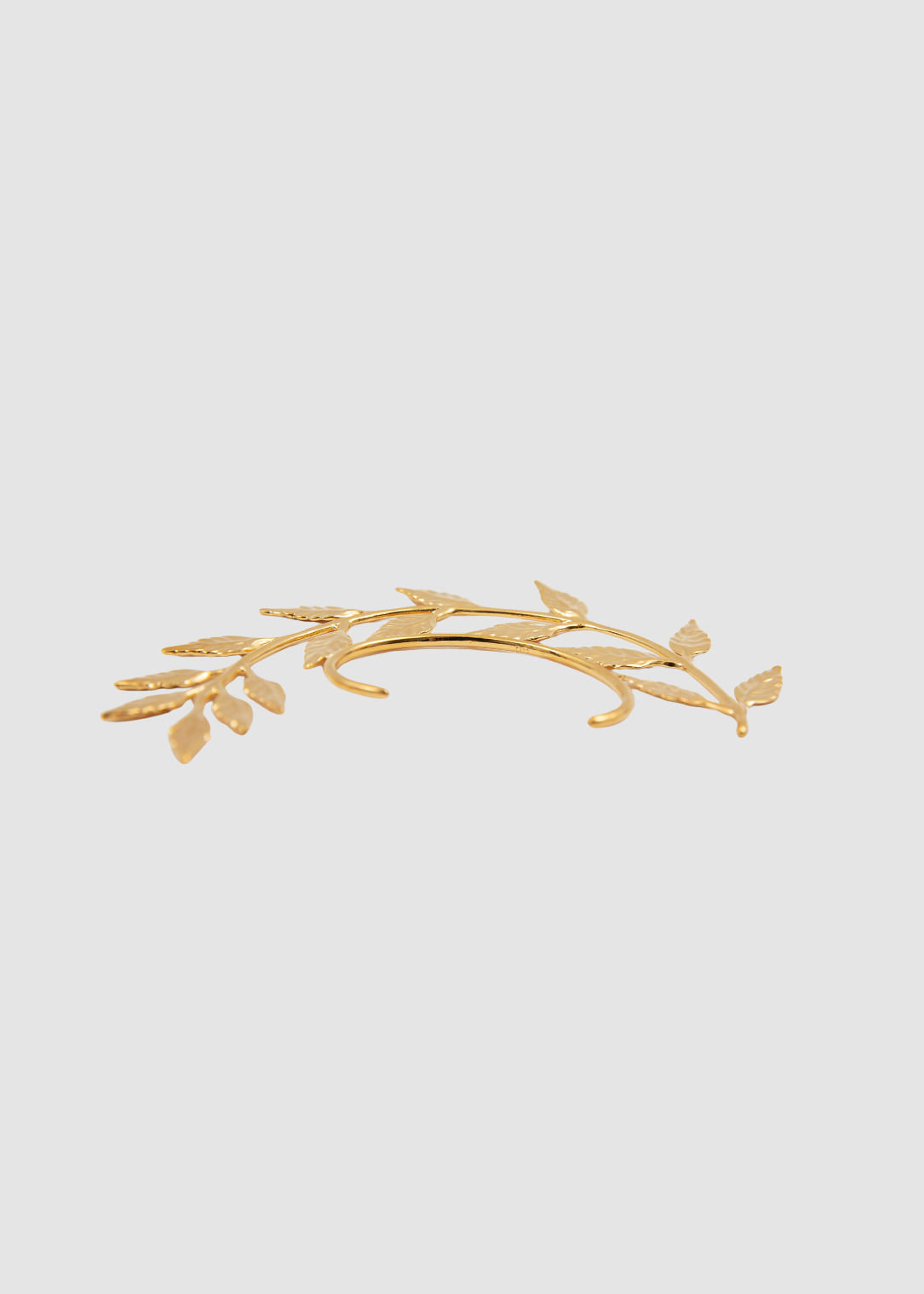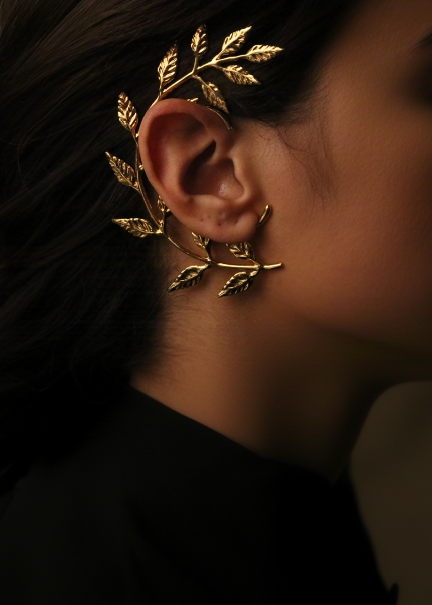 A sculptural ear accessory designed to follow the natural contour of the outer ear, combining botanical detailing with a minimal metal base.