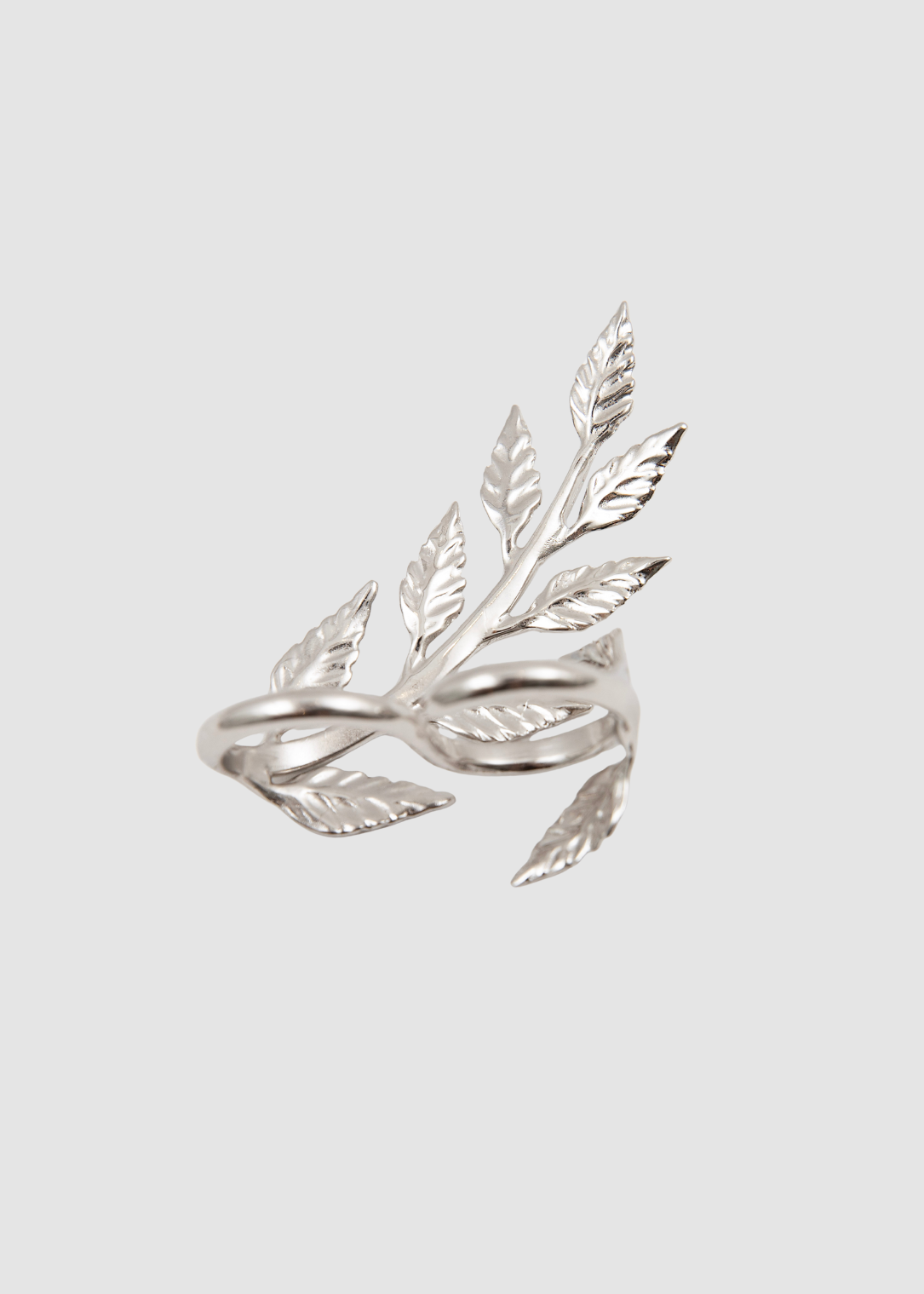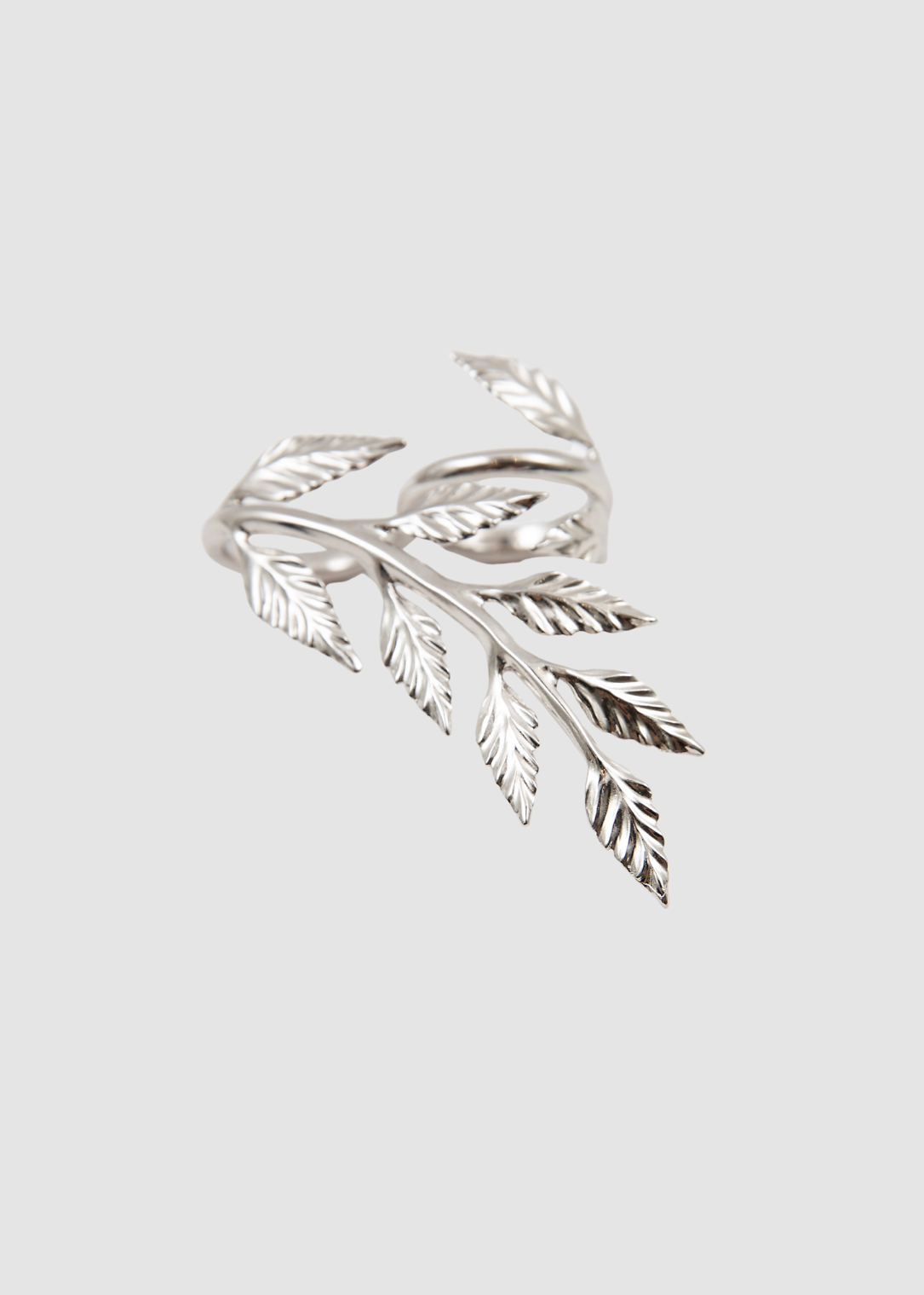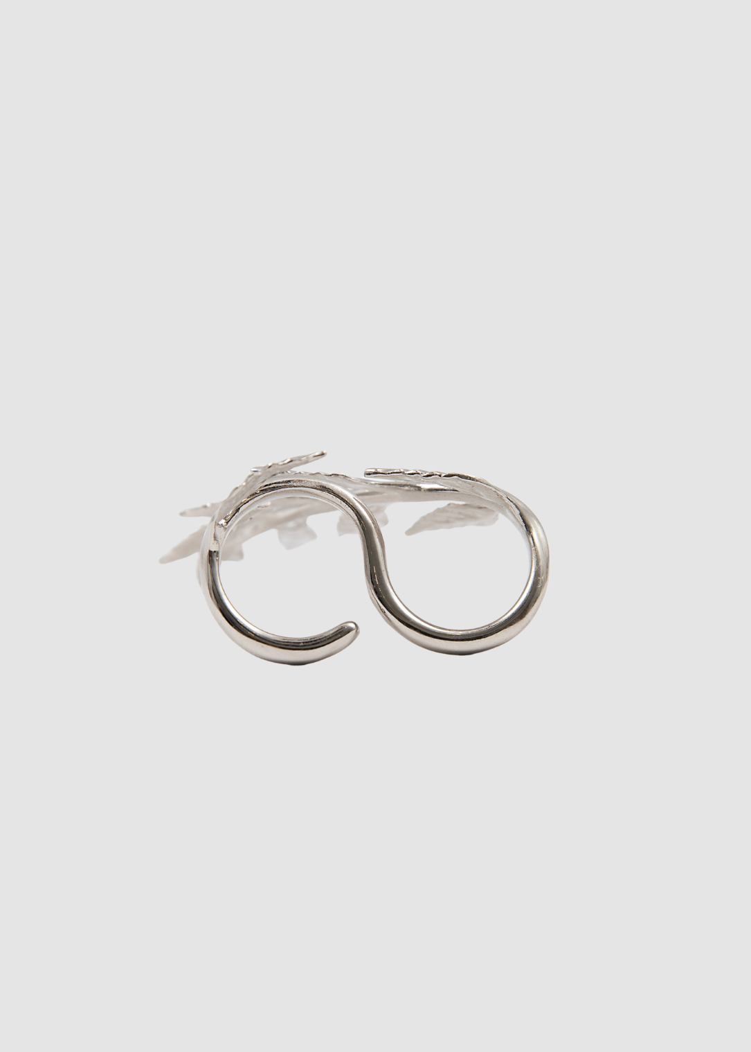A duo ring designed to span two fingers, featuring a sculpted leaf branch motif.