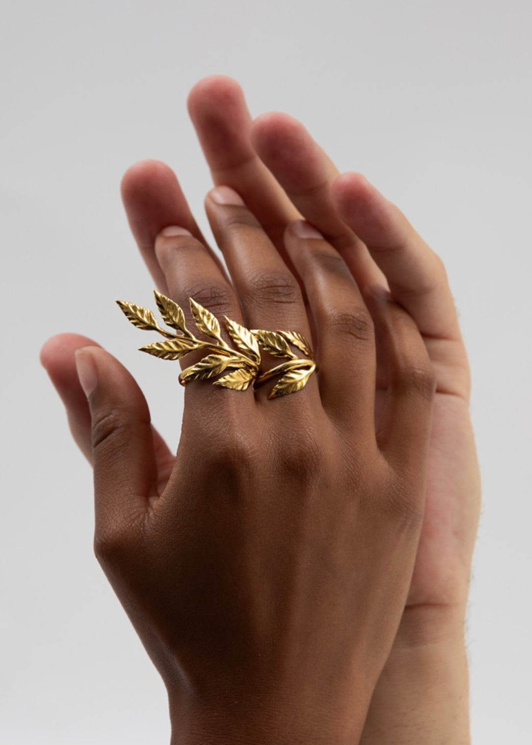 A duo ring designed to span two fingers, featuring a sculpted leaf branch motif.
