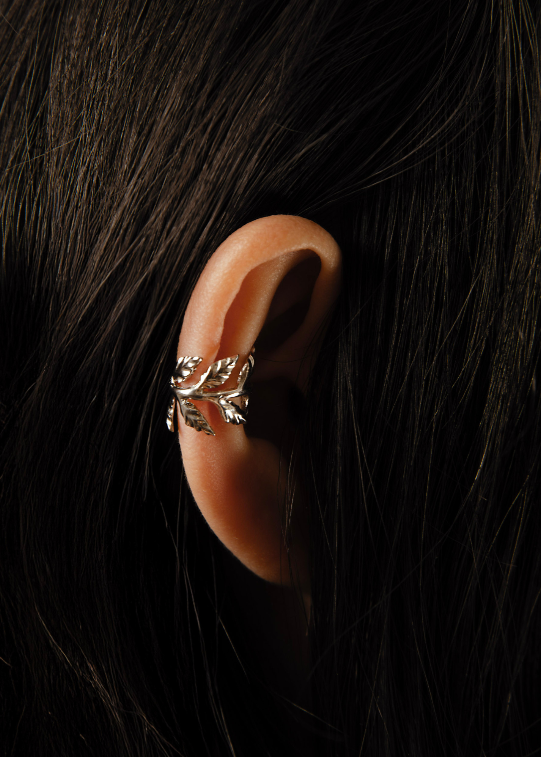 An open ring featuring a compact botanical motif (leaf branch), designed for non-pierced wear as an ear cuff or lip ring.