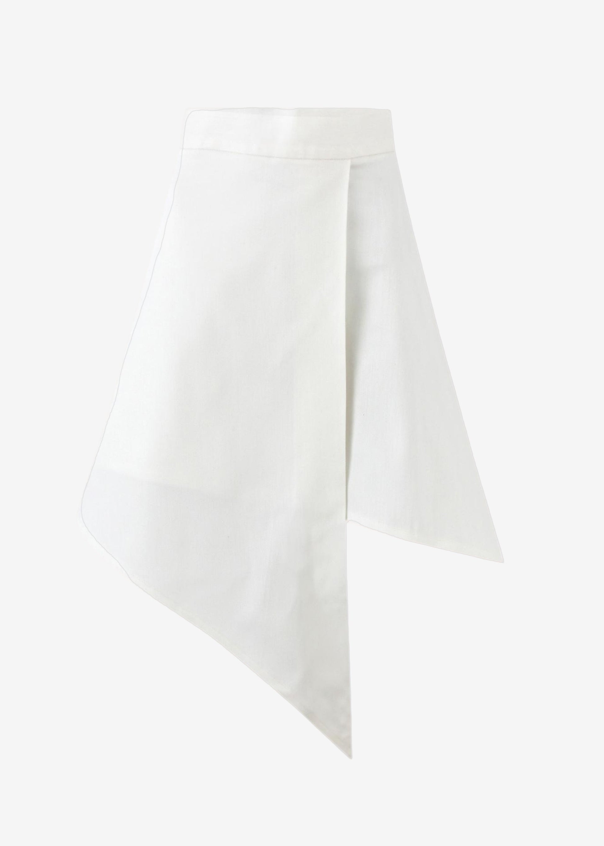 Structured asymmetrical skirt defined by its clean tailoring and architectural hemline