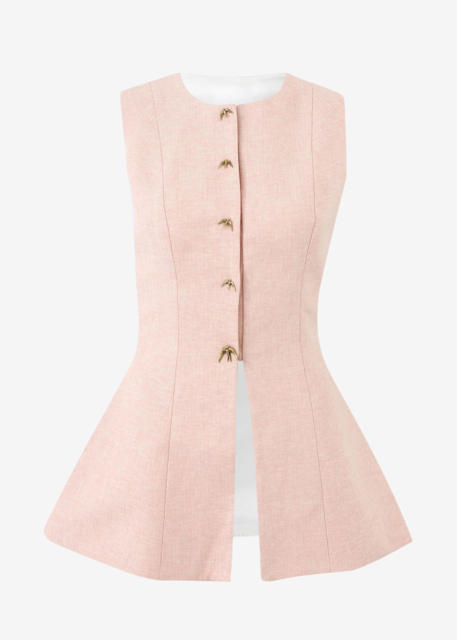 Sleeveless, structured tailored vest with a front slit and a flared hemline.