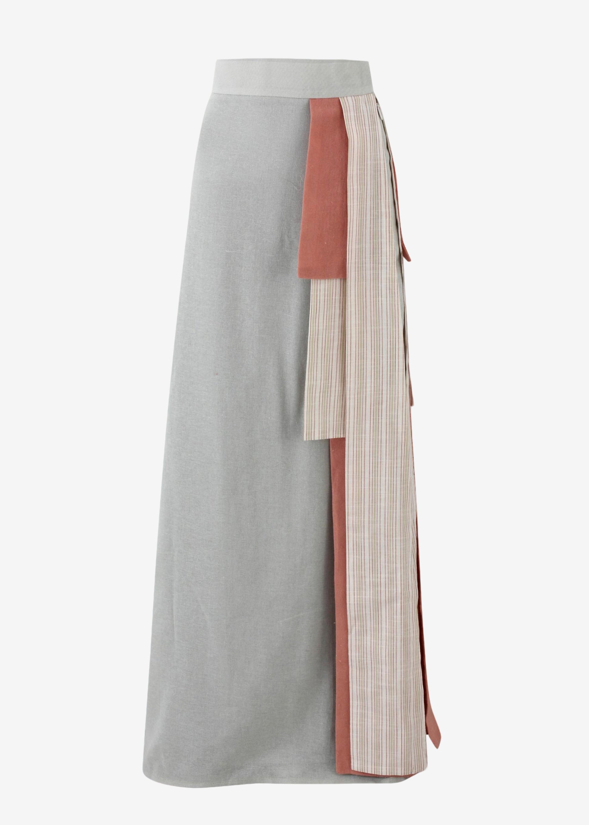 Long, high-waisted skirt with contrasting side panels and a fluid, floor-grazing silhouette.