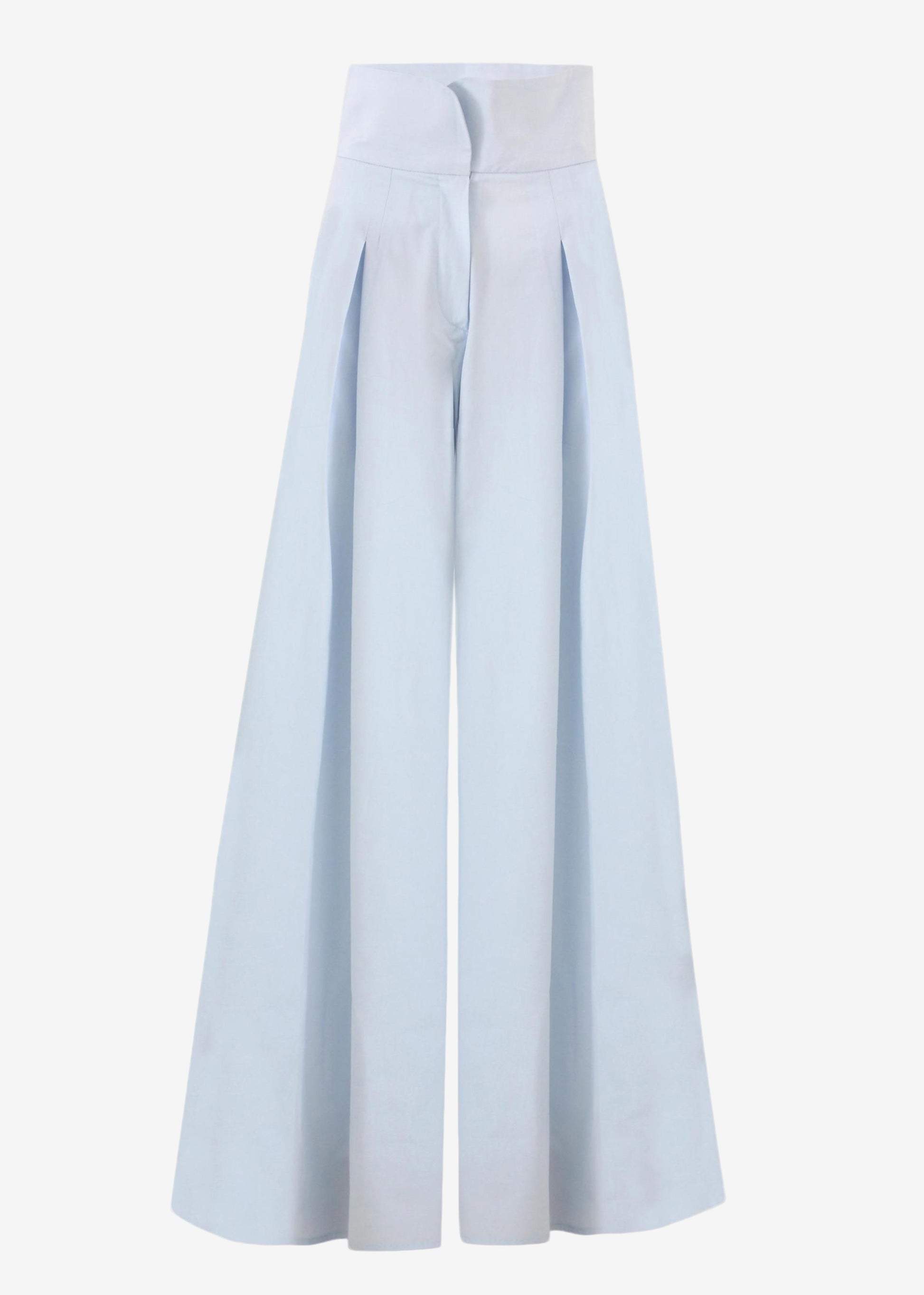 High-waisted, wide-leg cotton trousers with deep pleats.