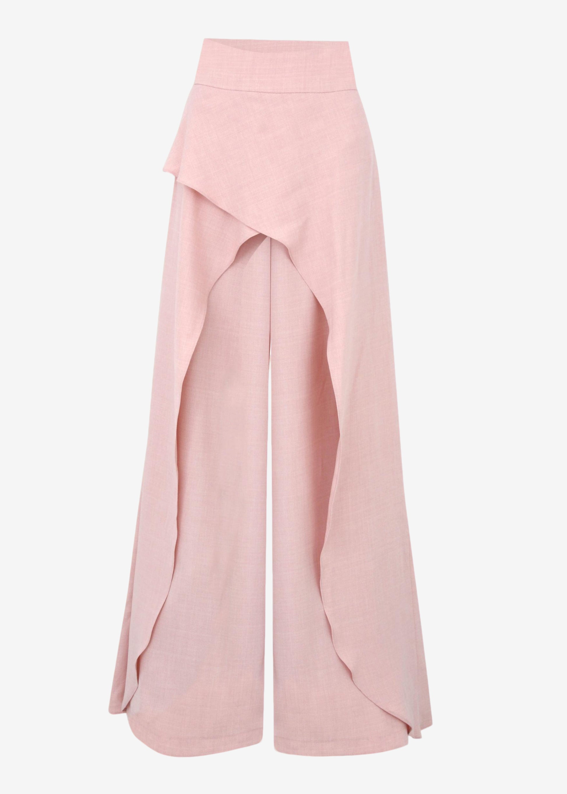 Wide-leg trousers featuring an asymmetrical draped overlay.