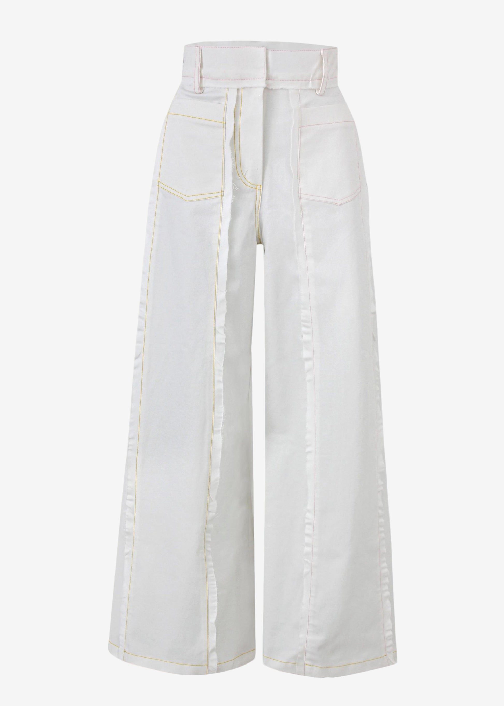 High-waisted trousers with a wide-leg silhouette and vertical gathered trims.