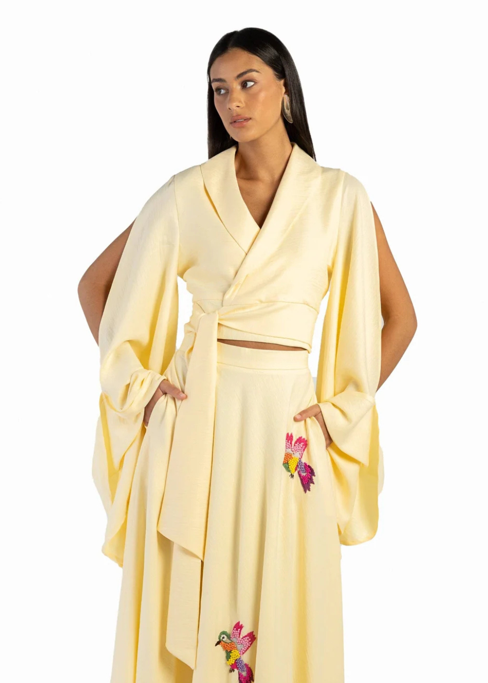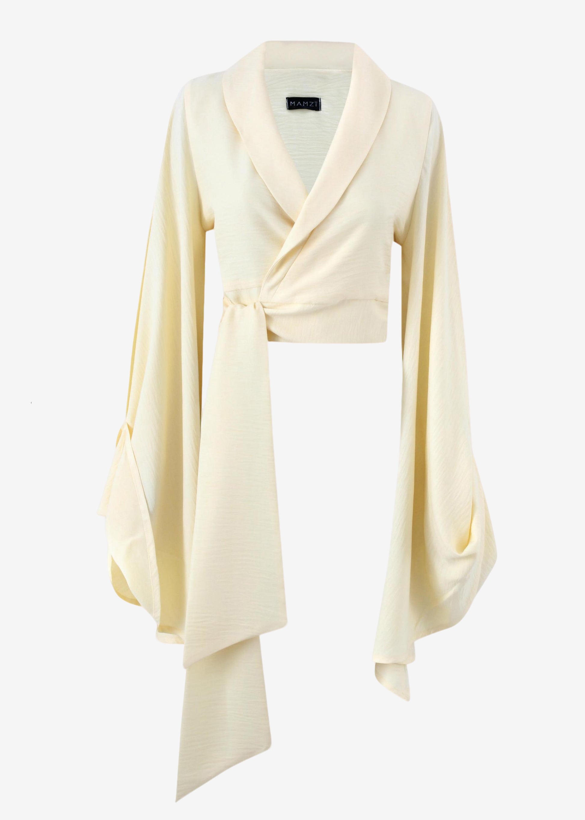 Wrap-style cropped top with voluminous sleeves and a soft collar.