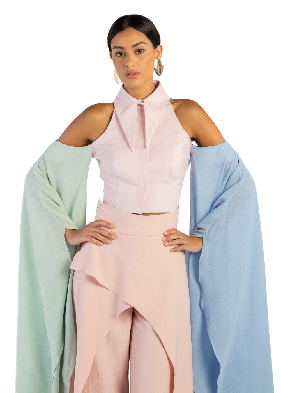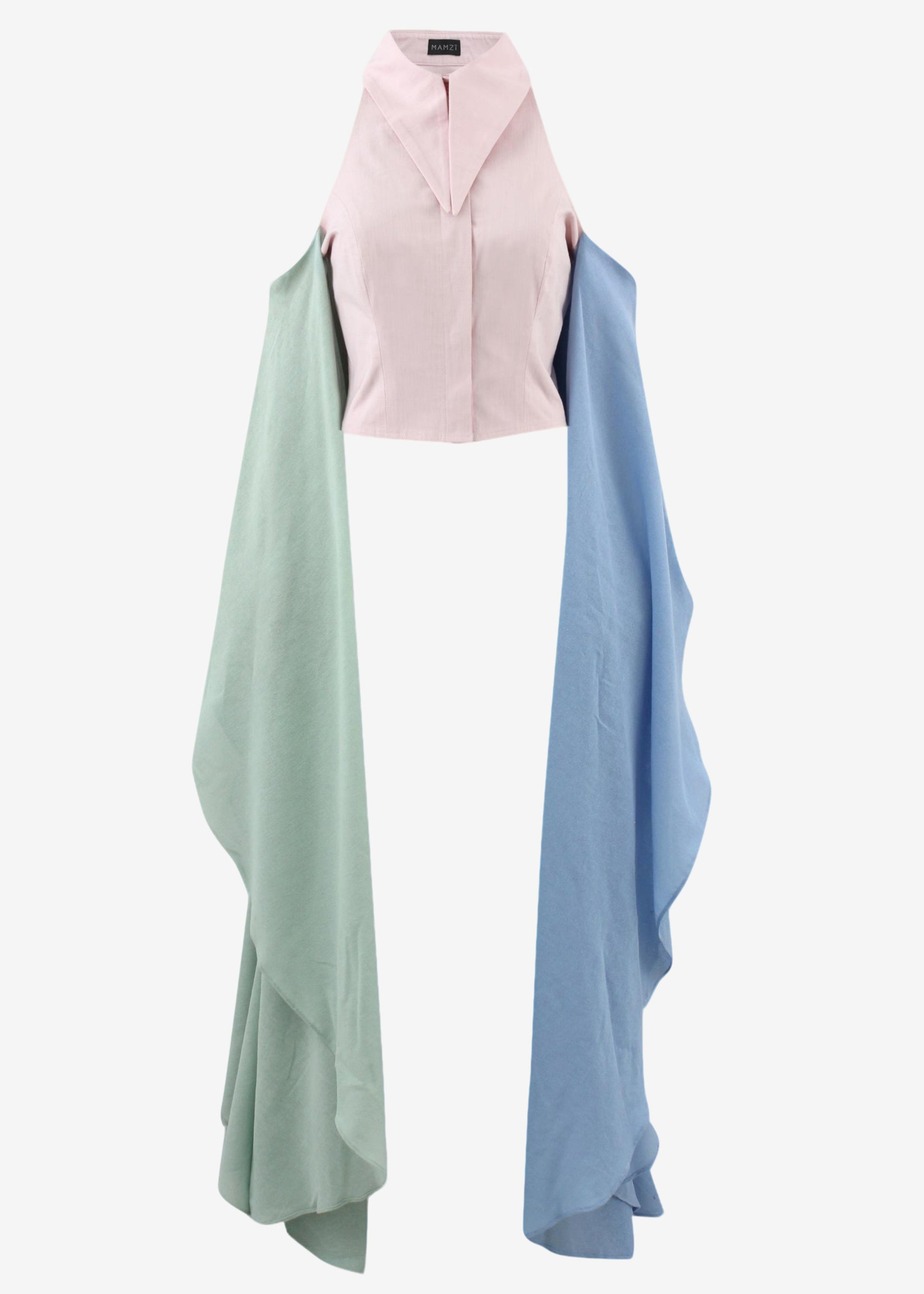 Halter-inspired cropped top featuring fluid, floor-length chiffon panels.