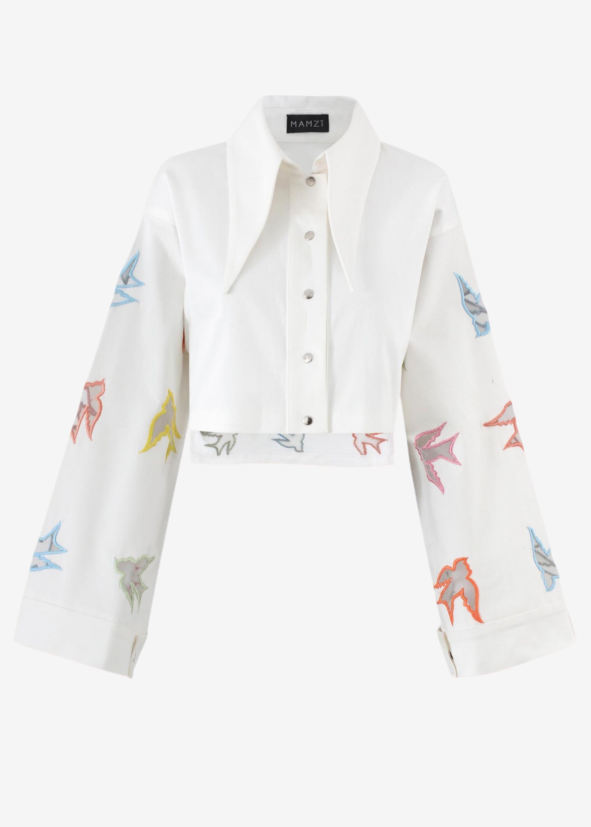 Cropped, boxy denim jacket adorned with vibrant hand embroidered birds and laser-cut details.