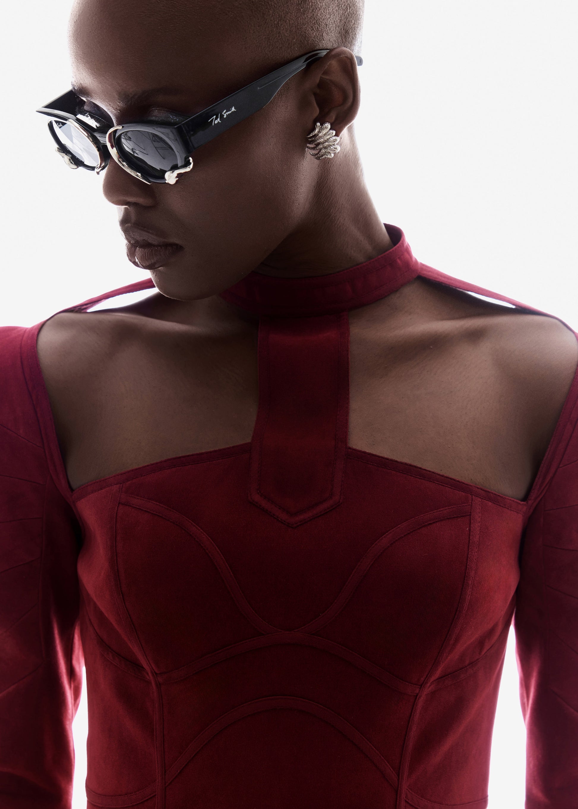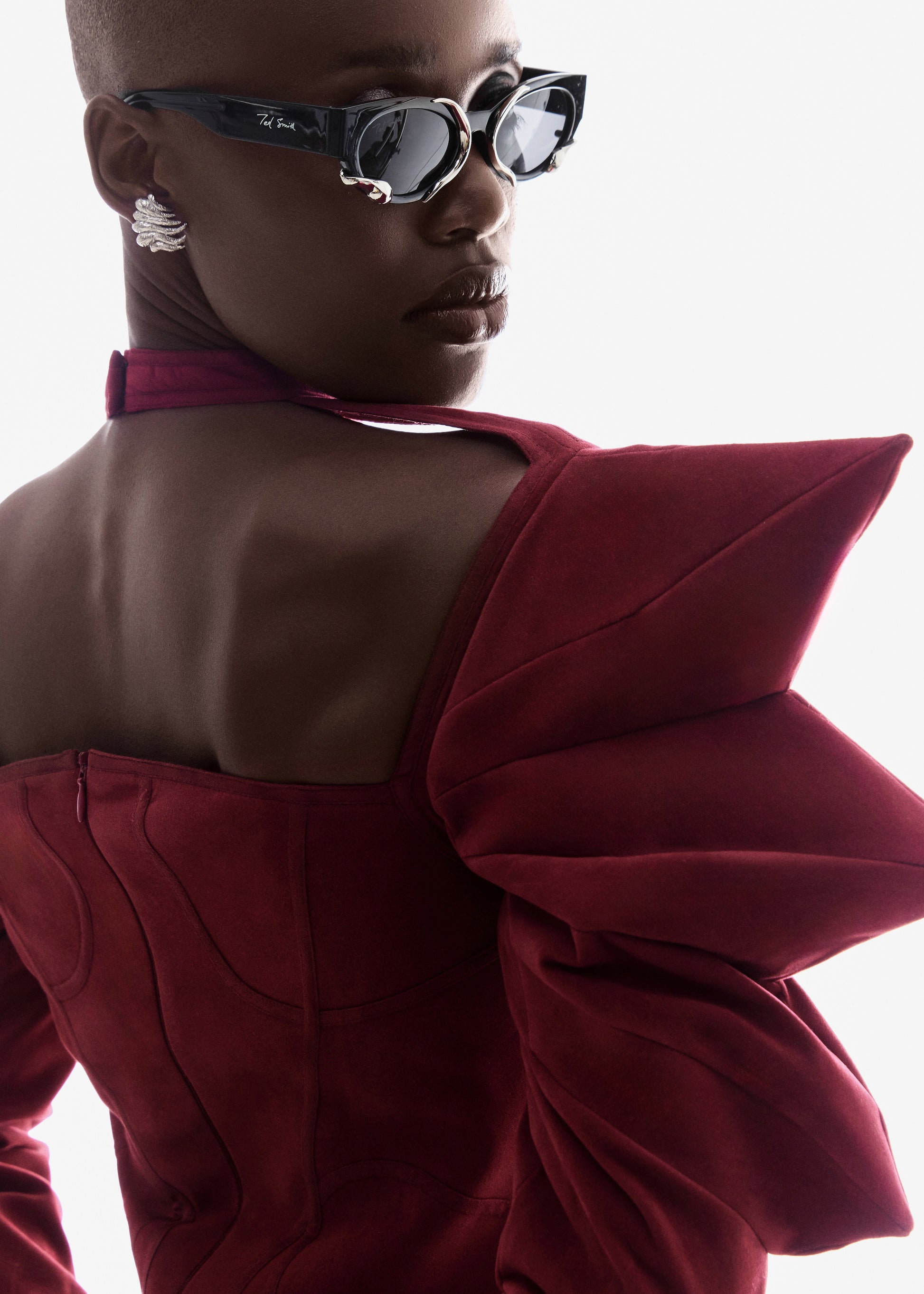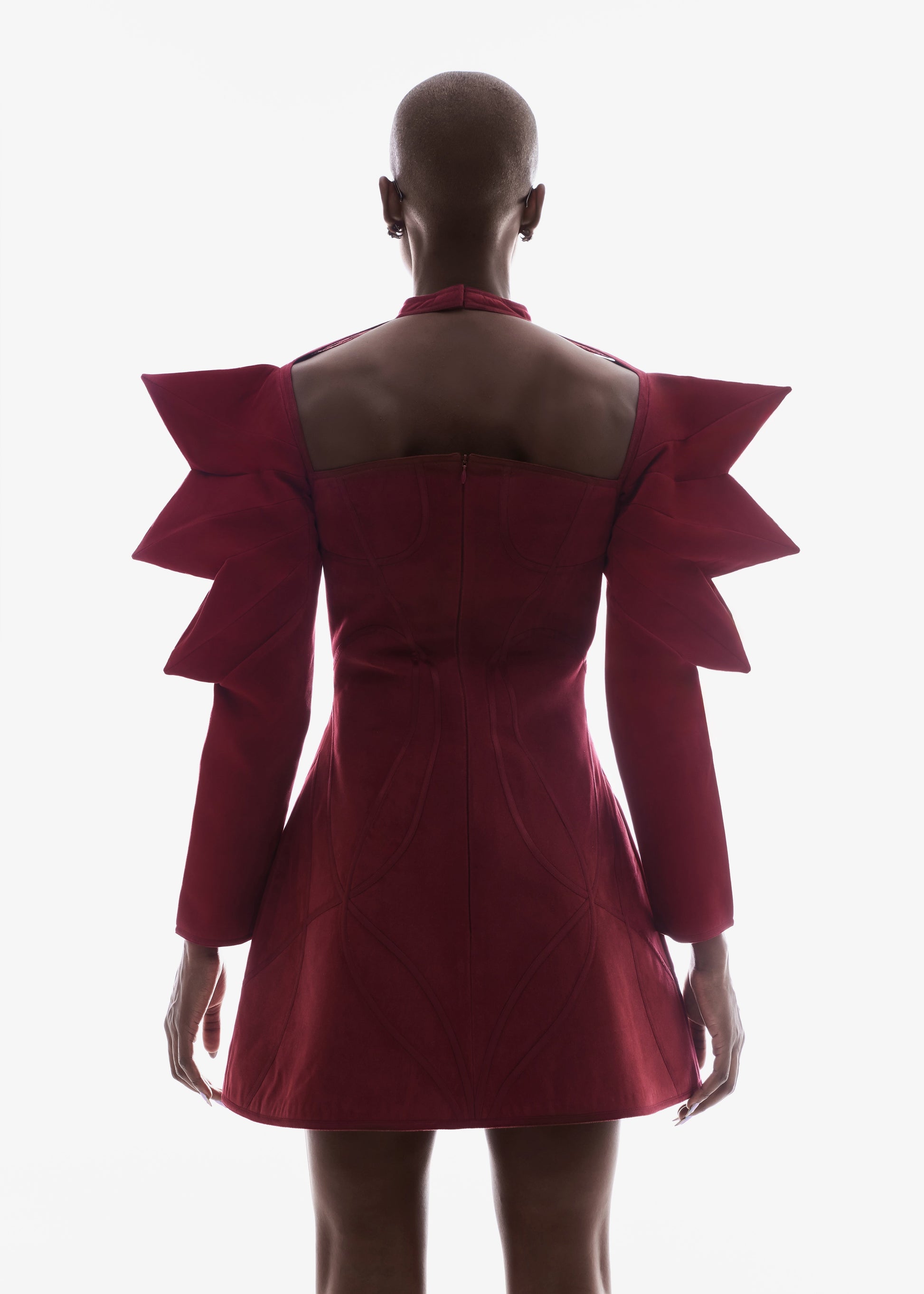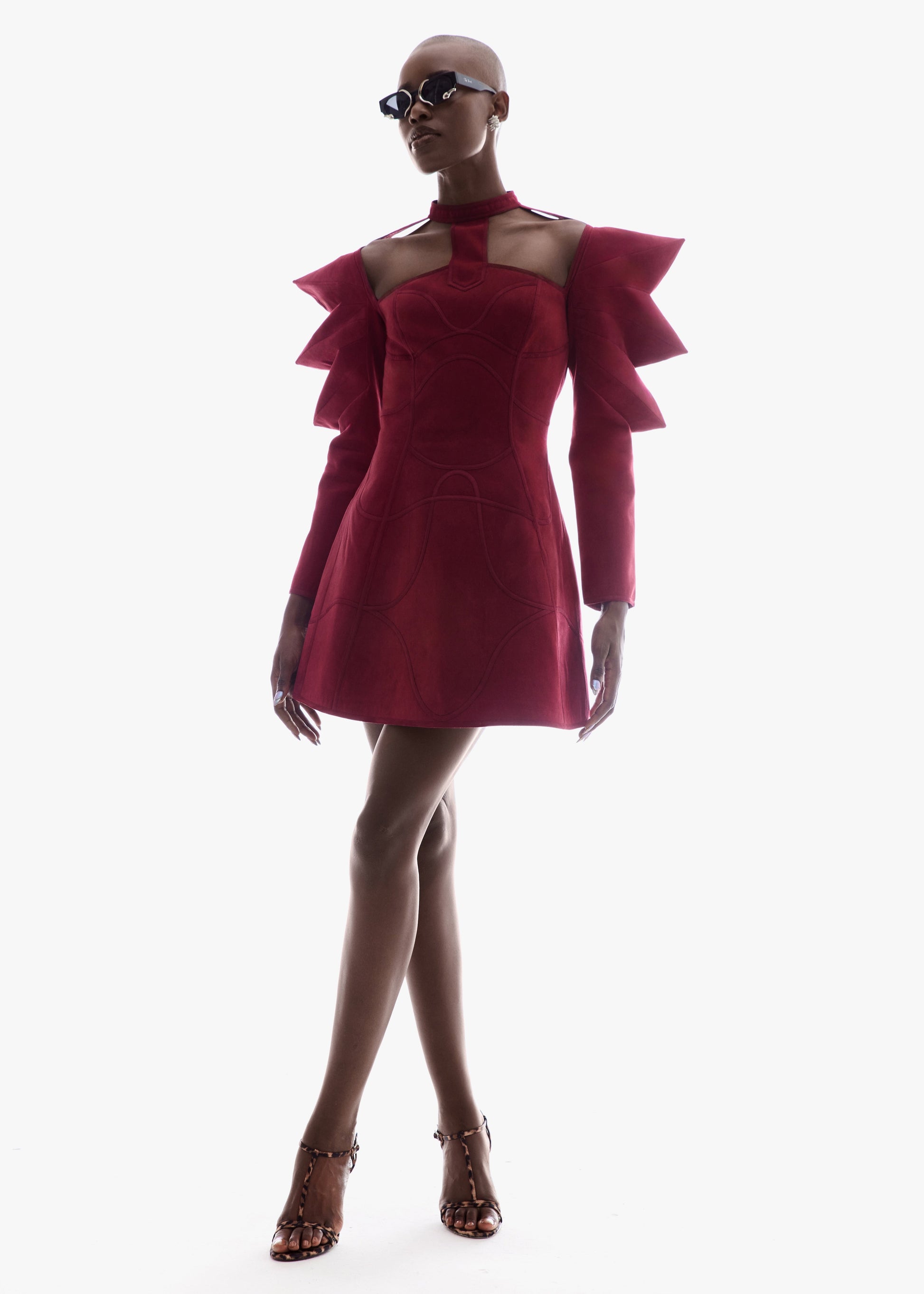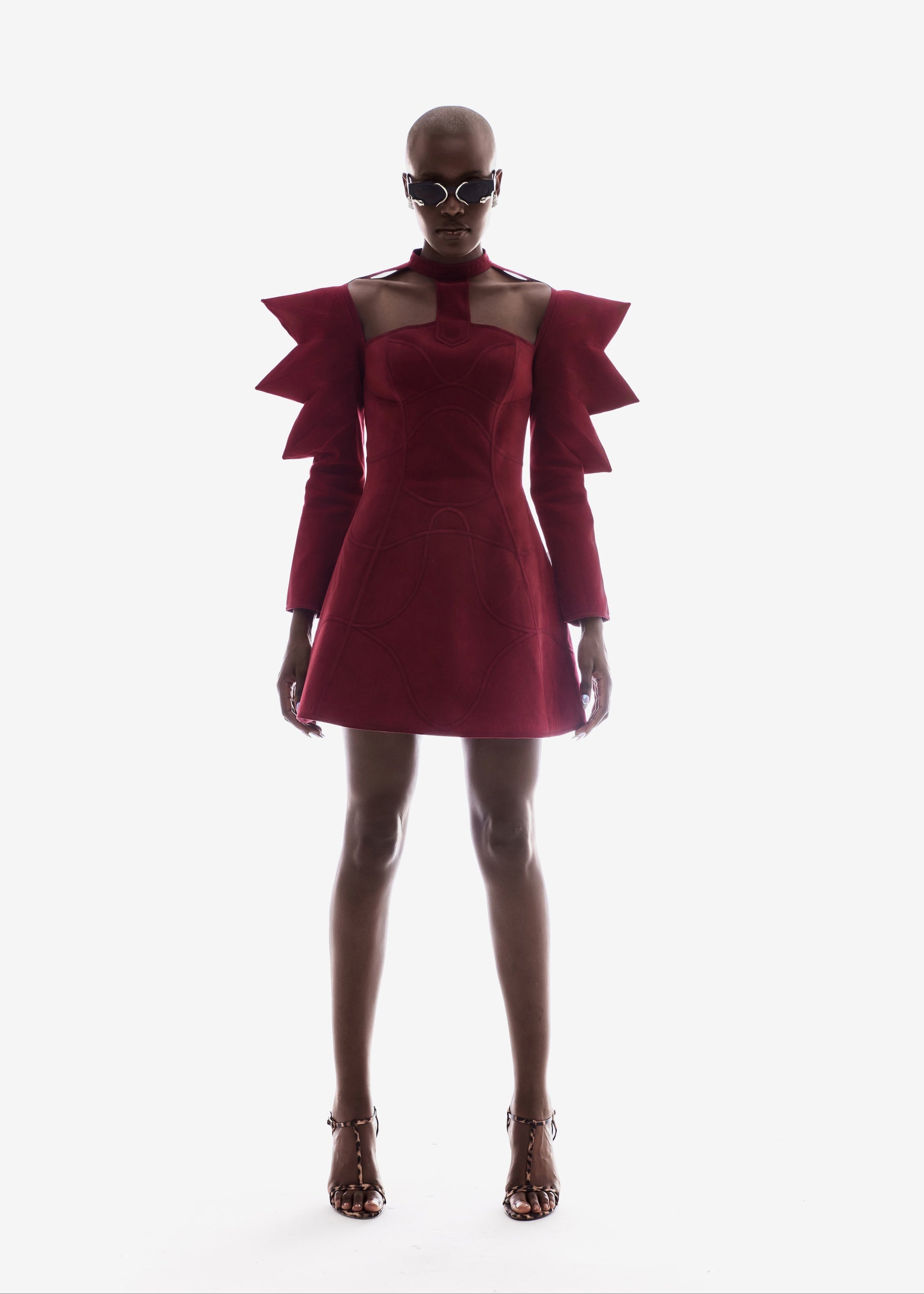 Sculptural mini dress with princess panels and angular shoulder detailing.