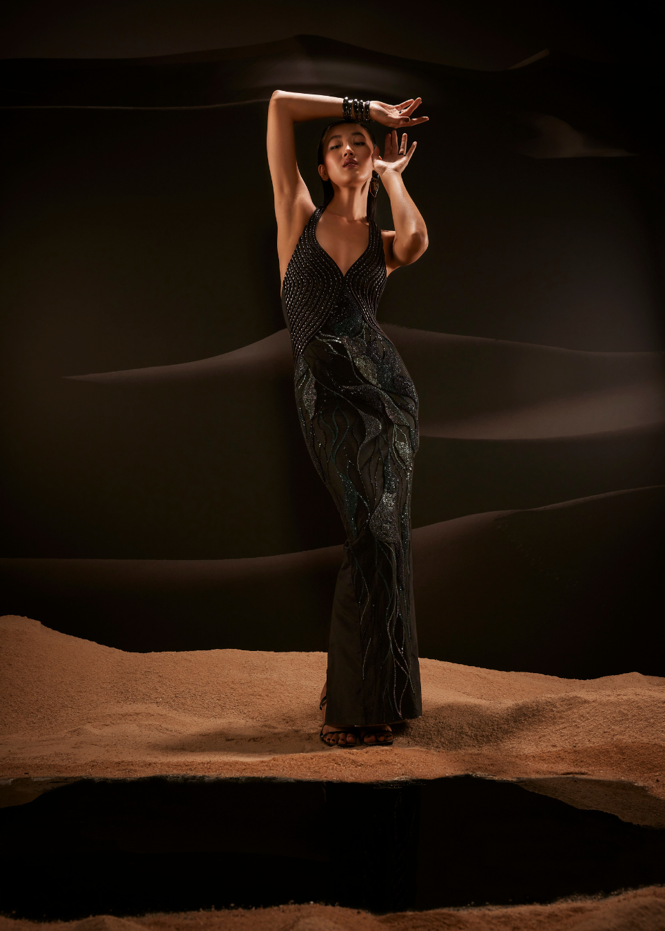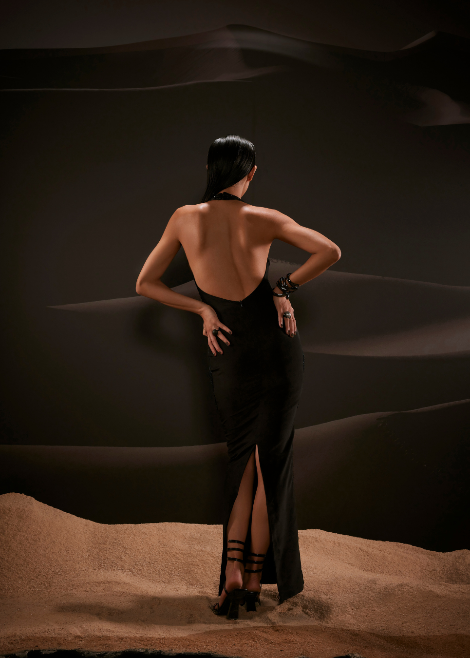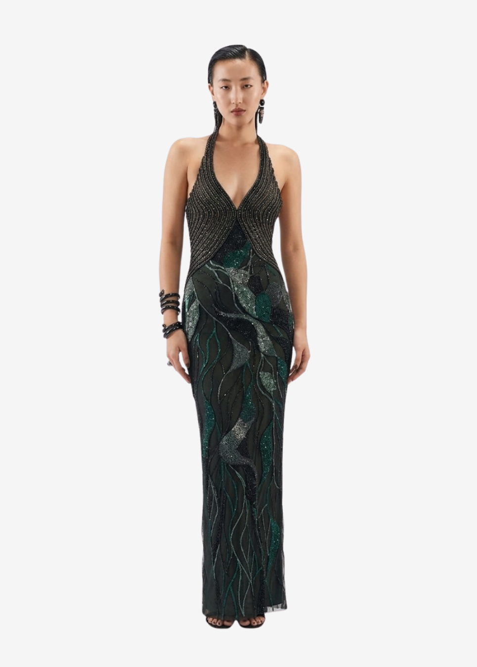 Hand-embroidered floor-length dress with an open back.