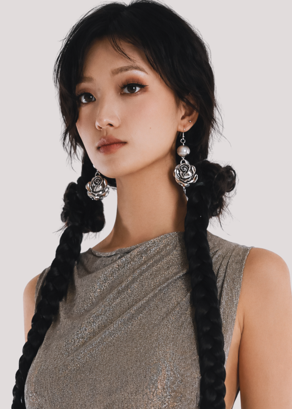Handcrafted drop earrings featuring Tahitian pearls and detailed rose charms.