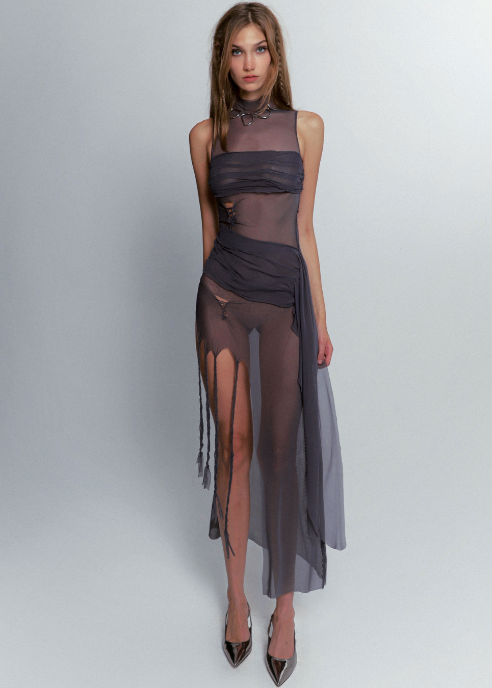 Asymmetrical hand draped sheer sleeveless mesh dress with a hood.