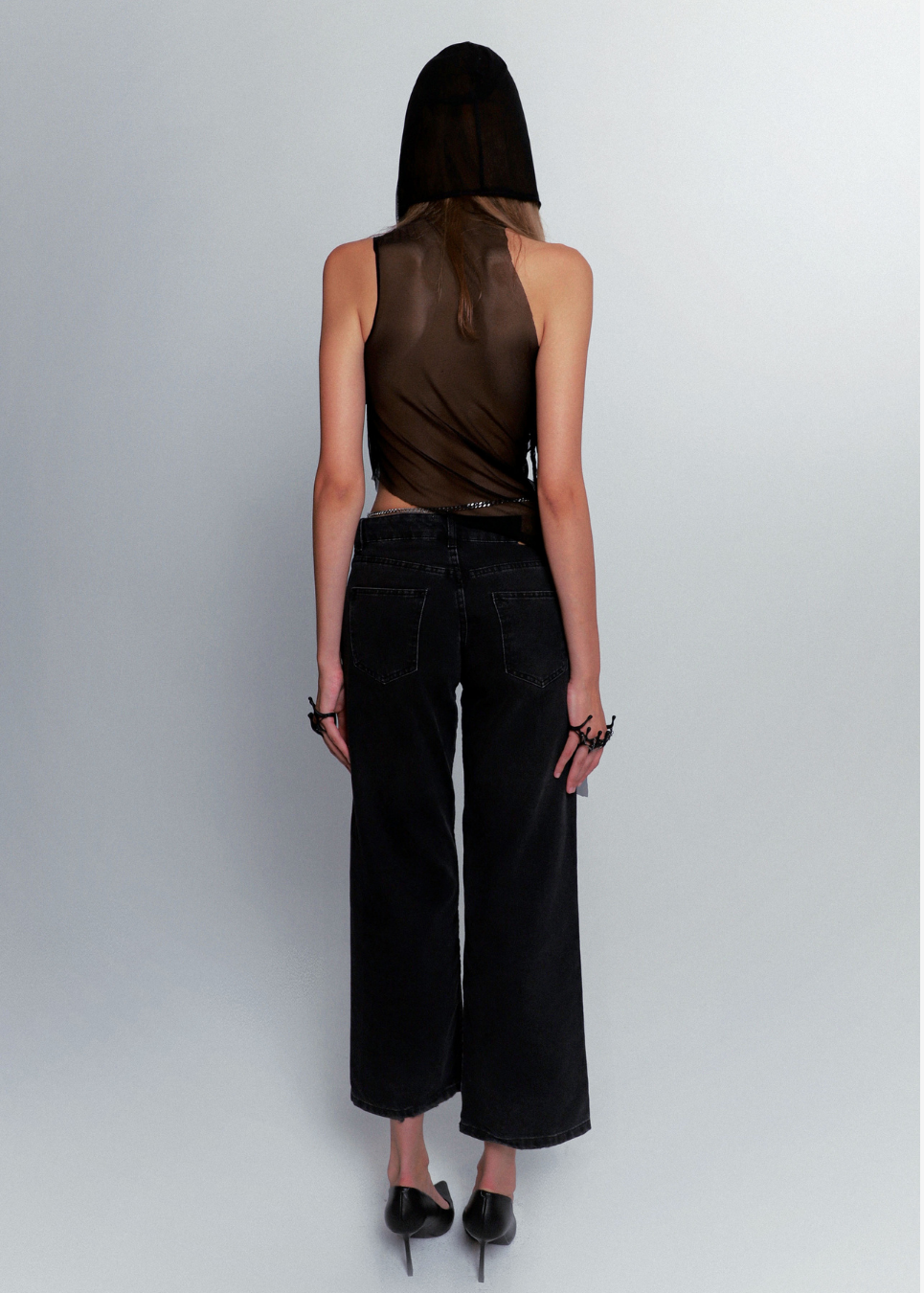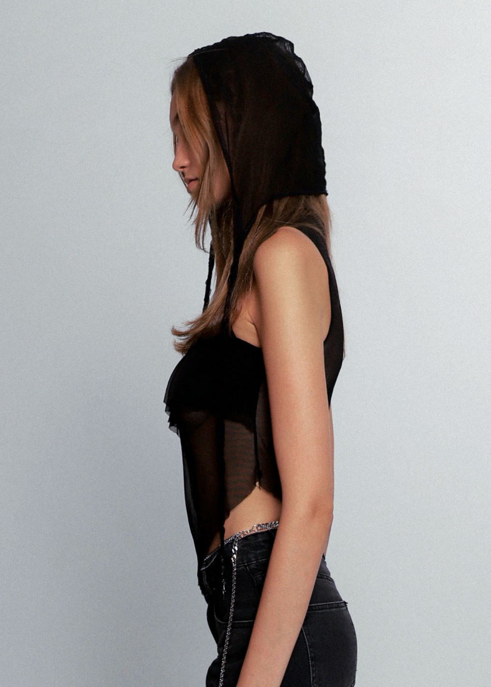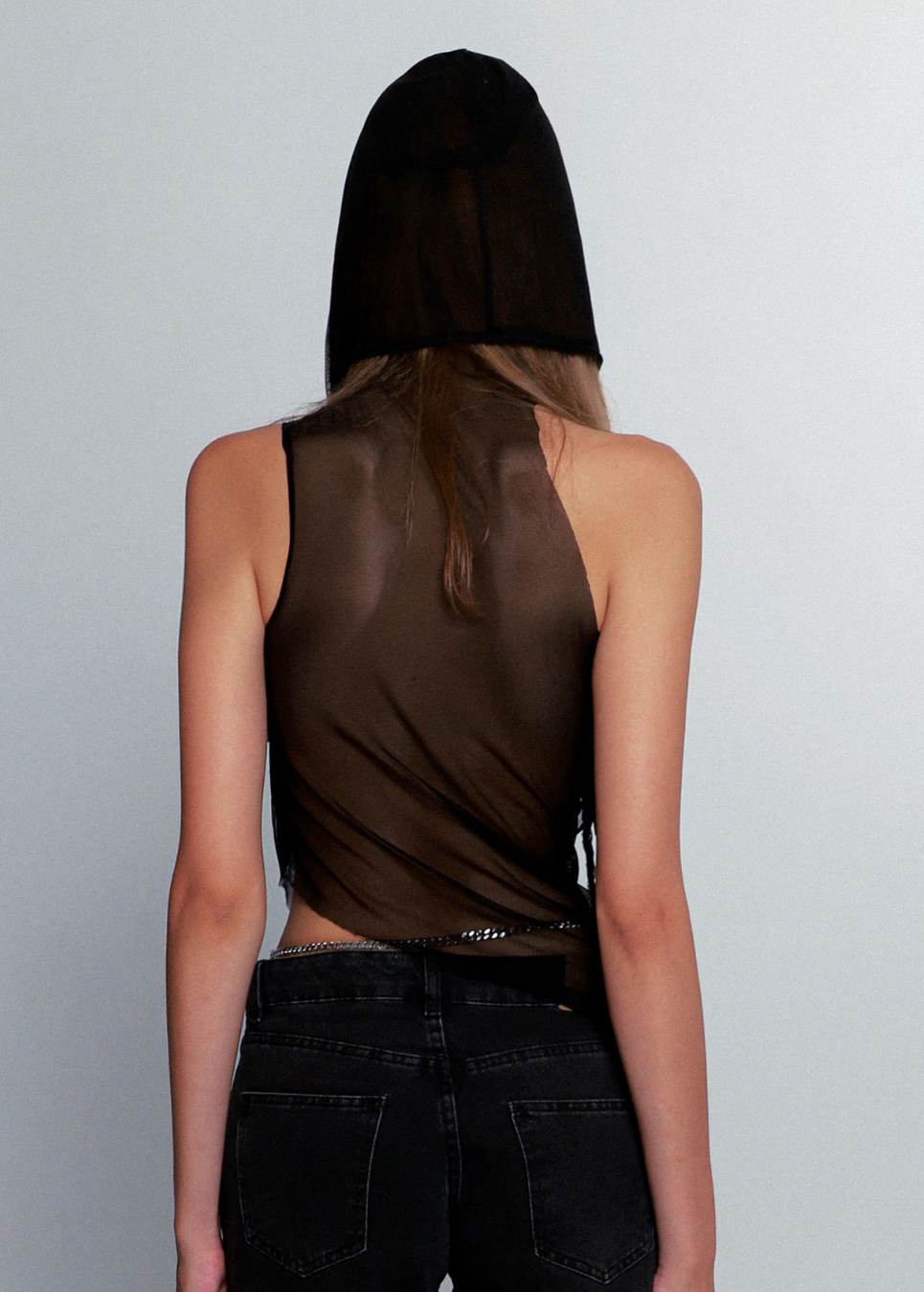 Asymmetric sleeveless mesh top with shoulder cutout.
