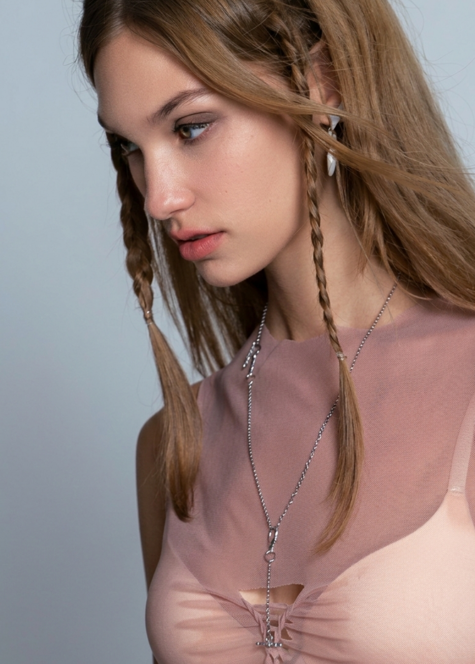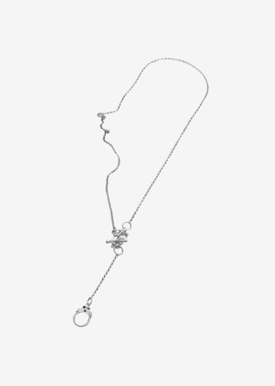 Long necklace with bar and loop front pendant clasp.