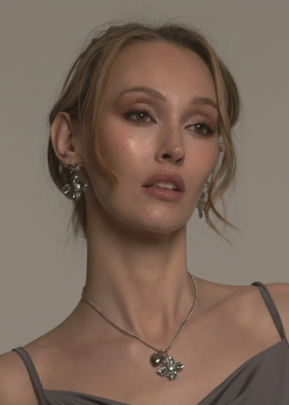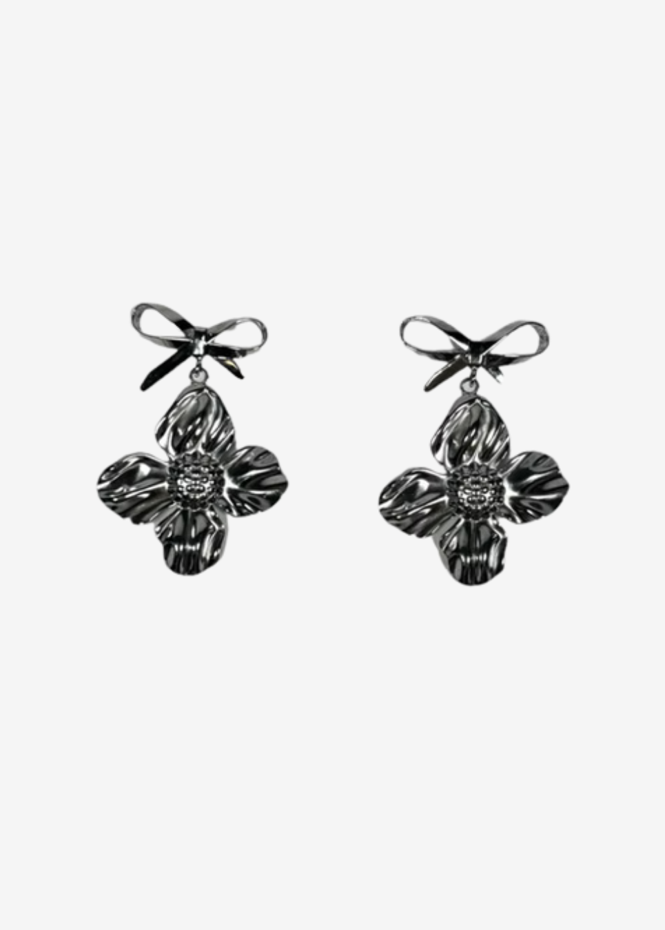 Drop earrings featuring a bow motif and a four-petal flower charm.