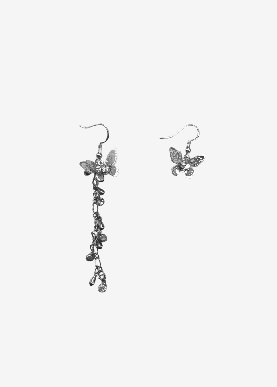Asymmetrical length dangle earrings with butterflies.