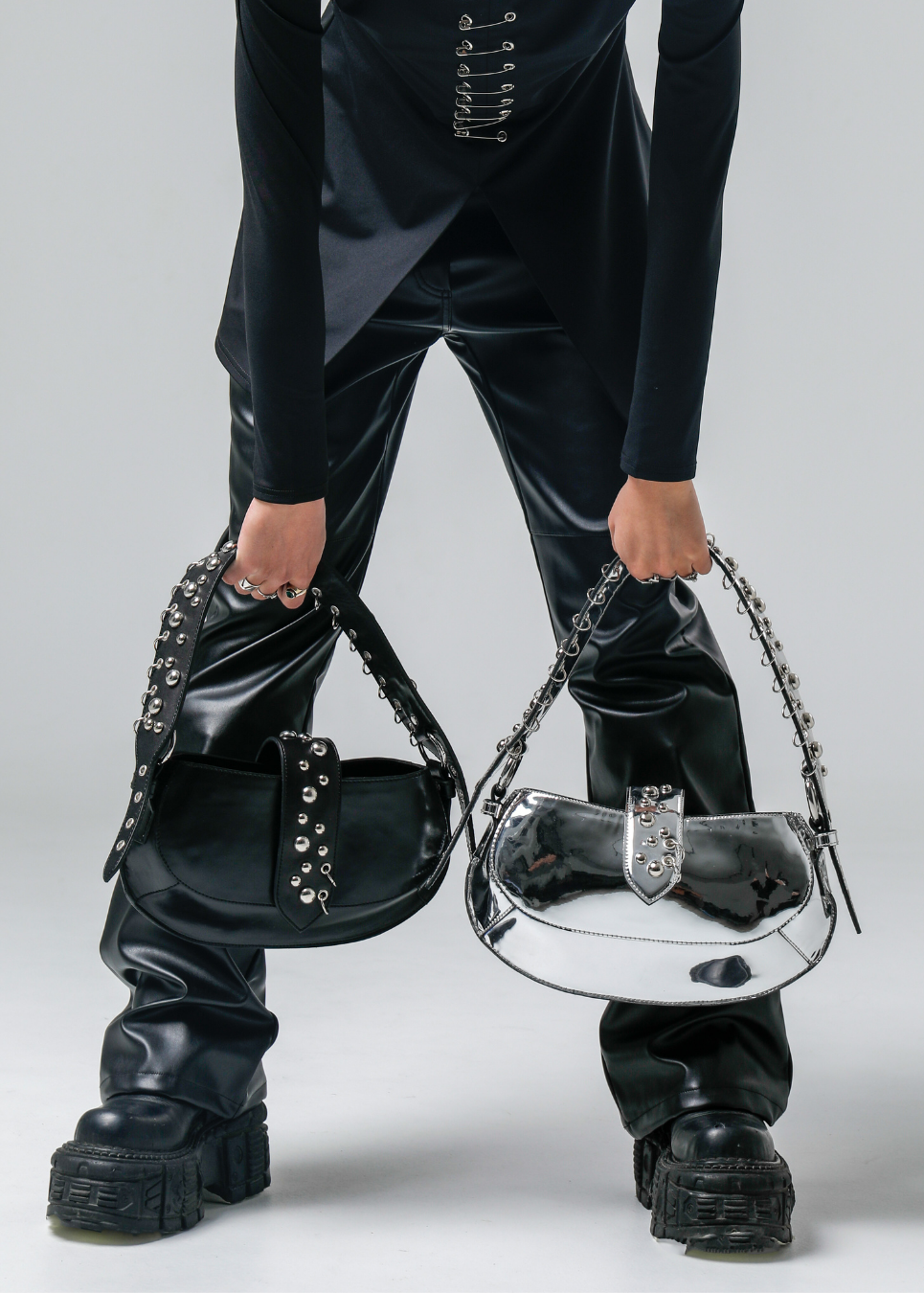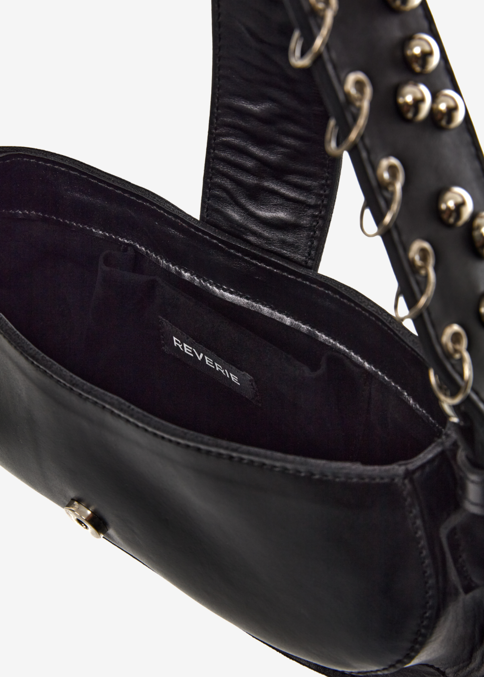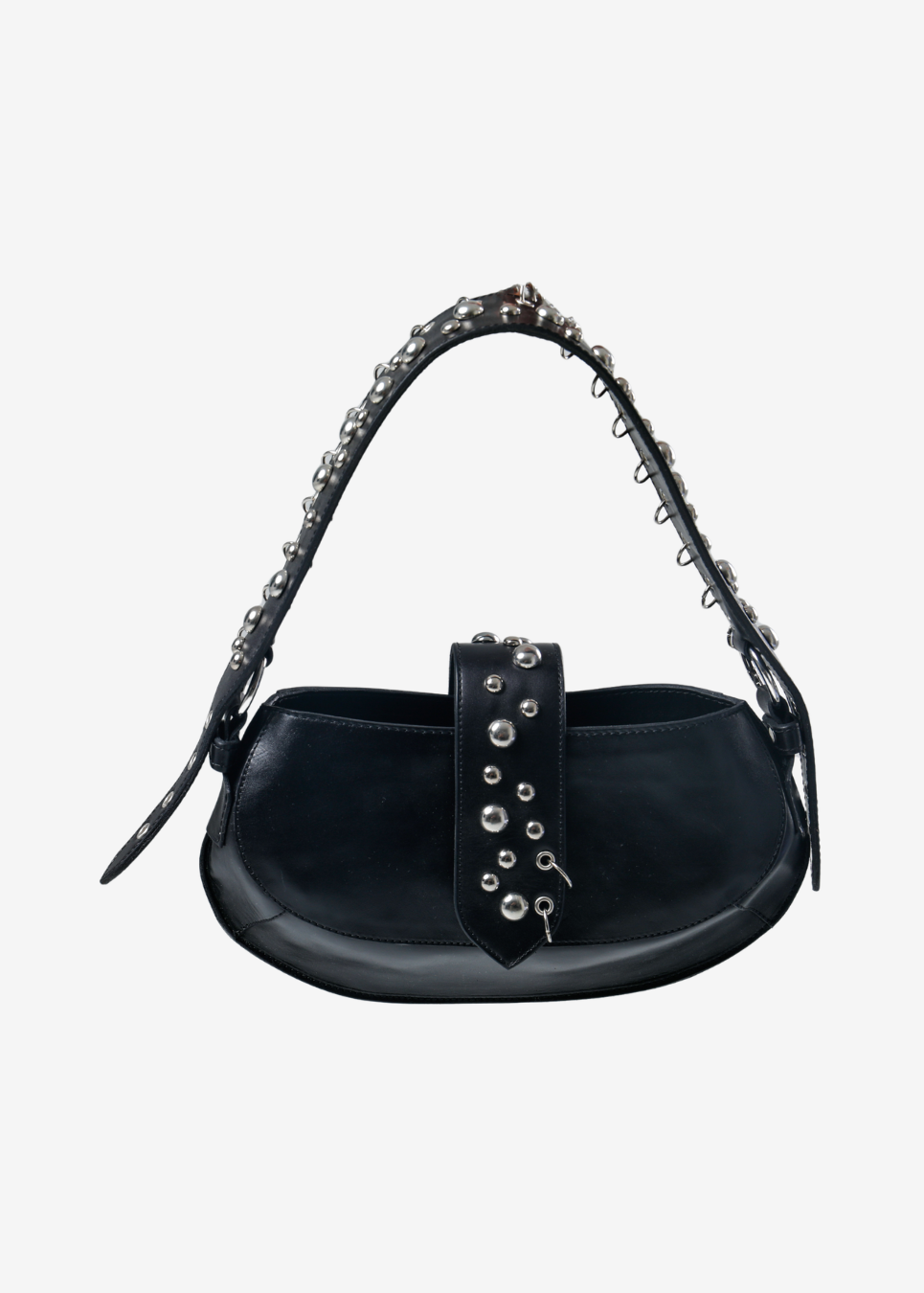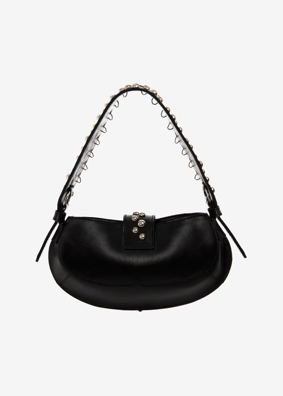 Leather handbag with a smooth rounded base and stud detailing placed on both the handle and the center flap.