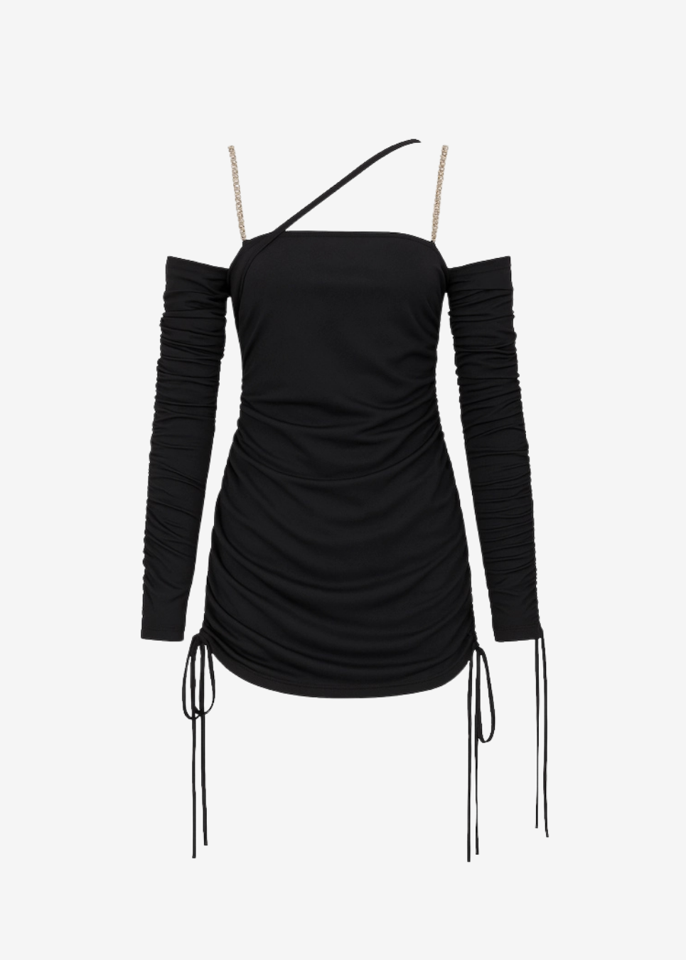 Mini dress featuring integrated ruched sleeves, metallic shoulder straps, and an asymmetrical adjustable silhouette.
