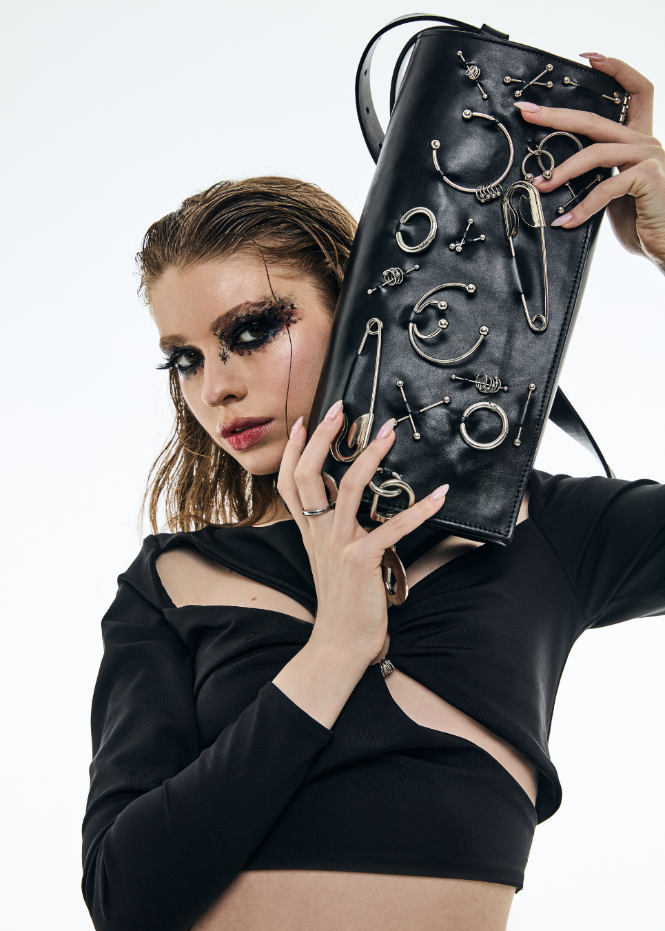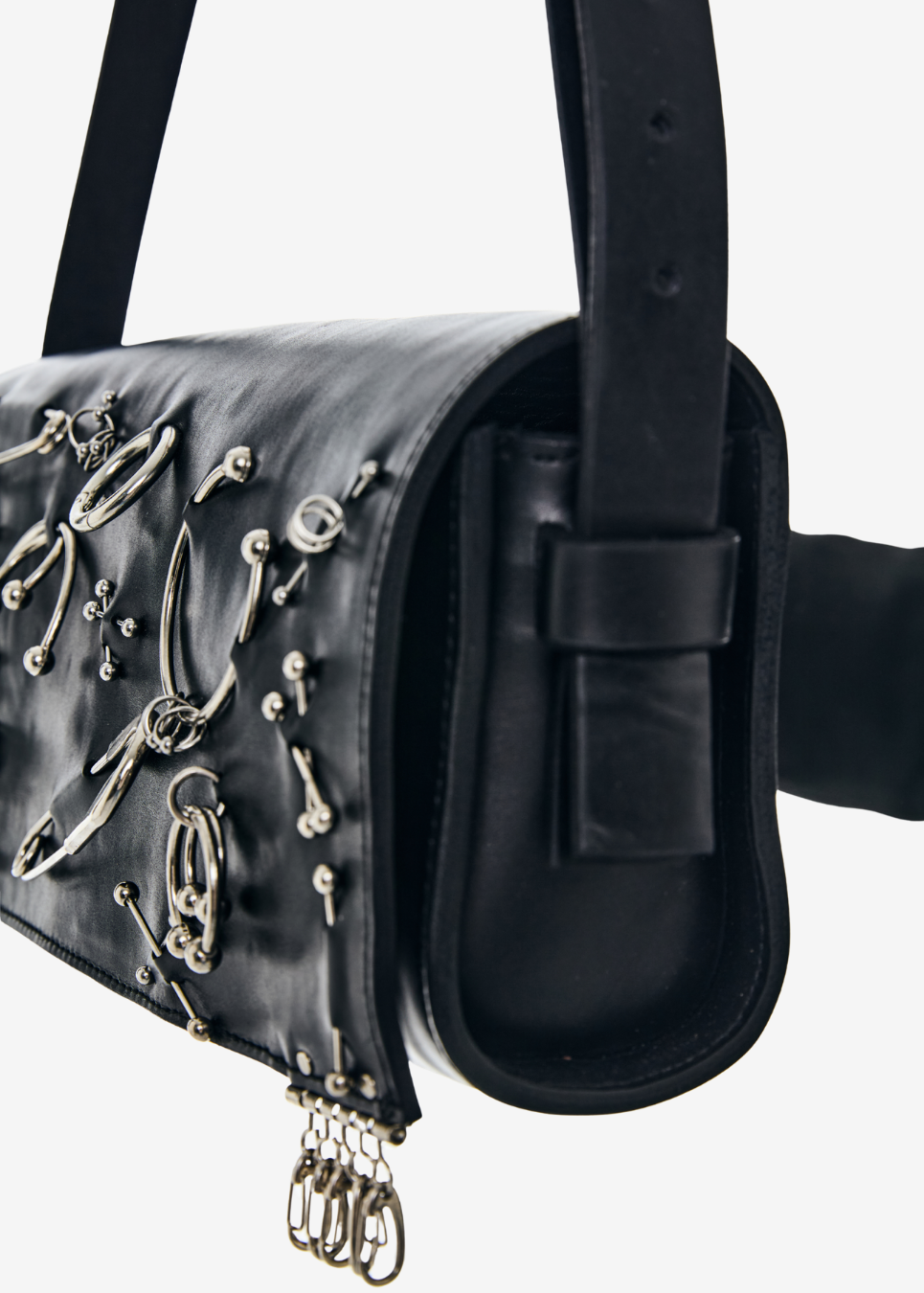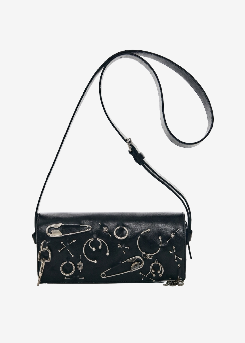 Rectangular shoulder/crossbody bag adorned with silver-tone metal charms.