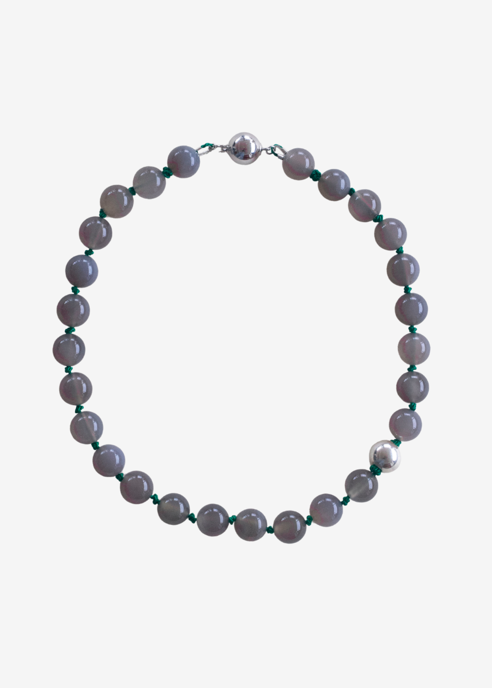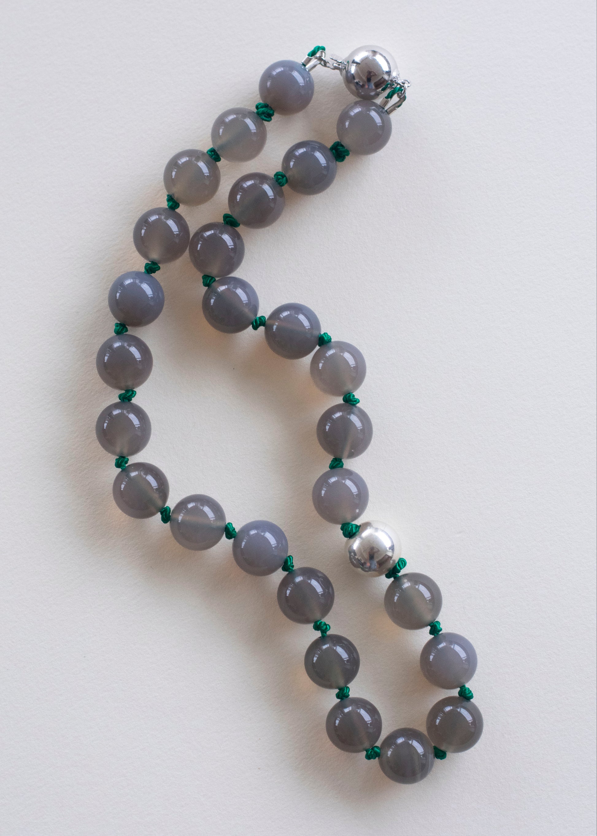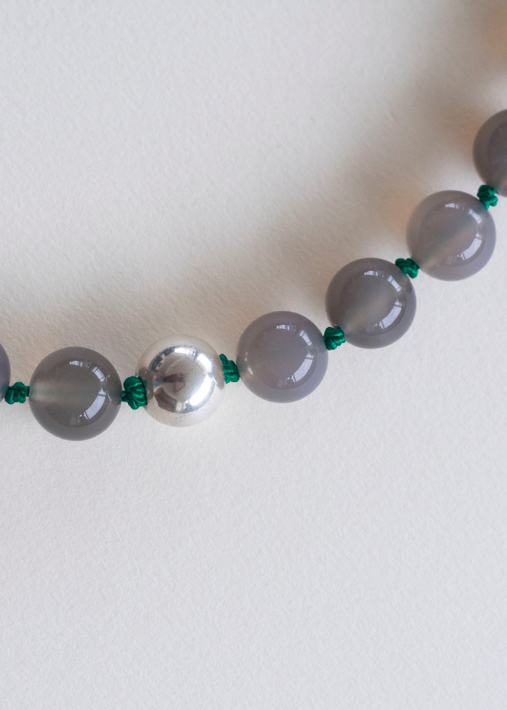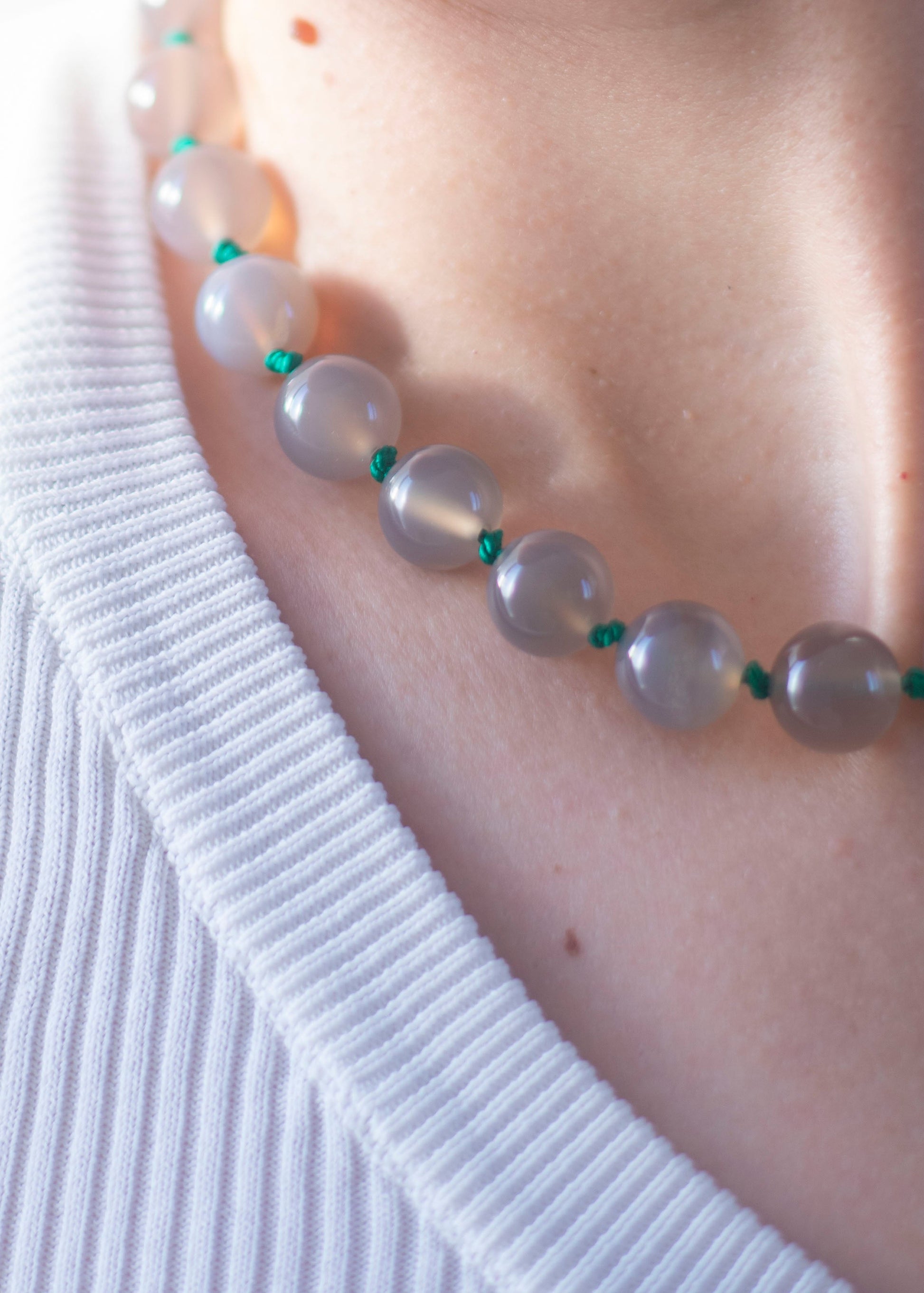 Hand-knotted grey agate necklace on an emerald silk thread and knots between each bead.