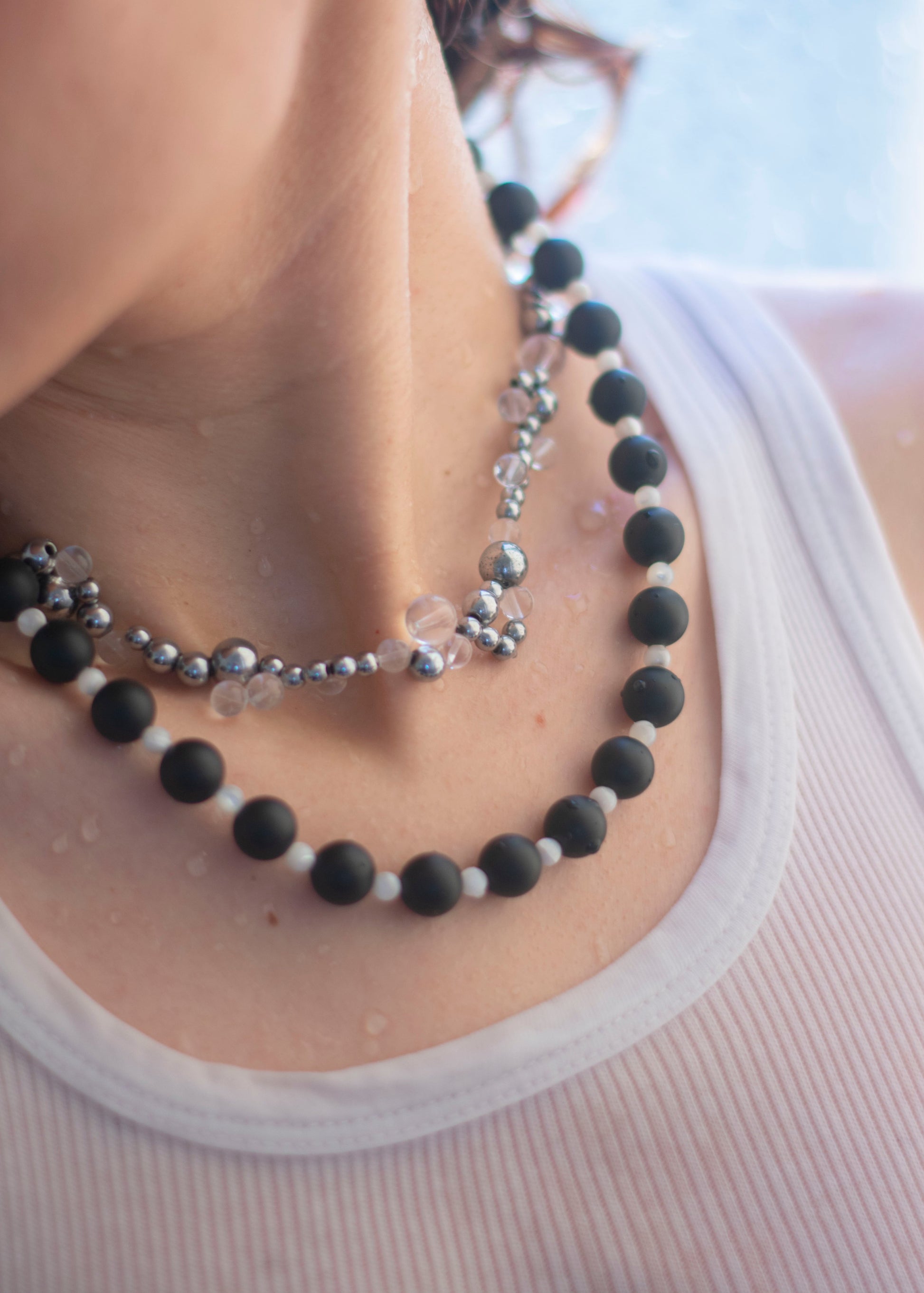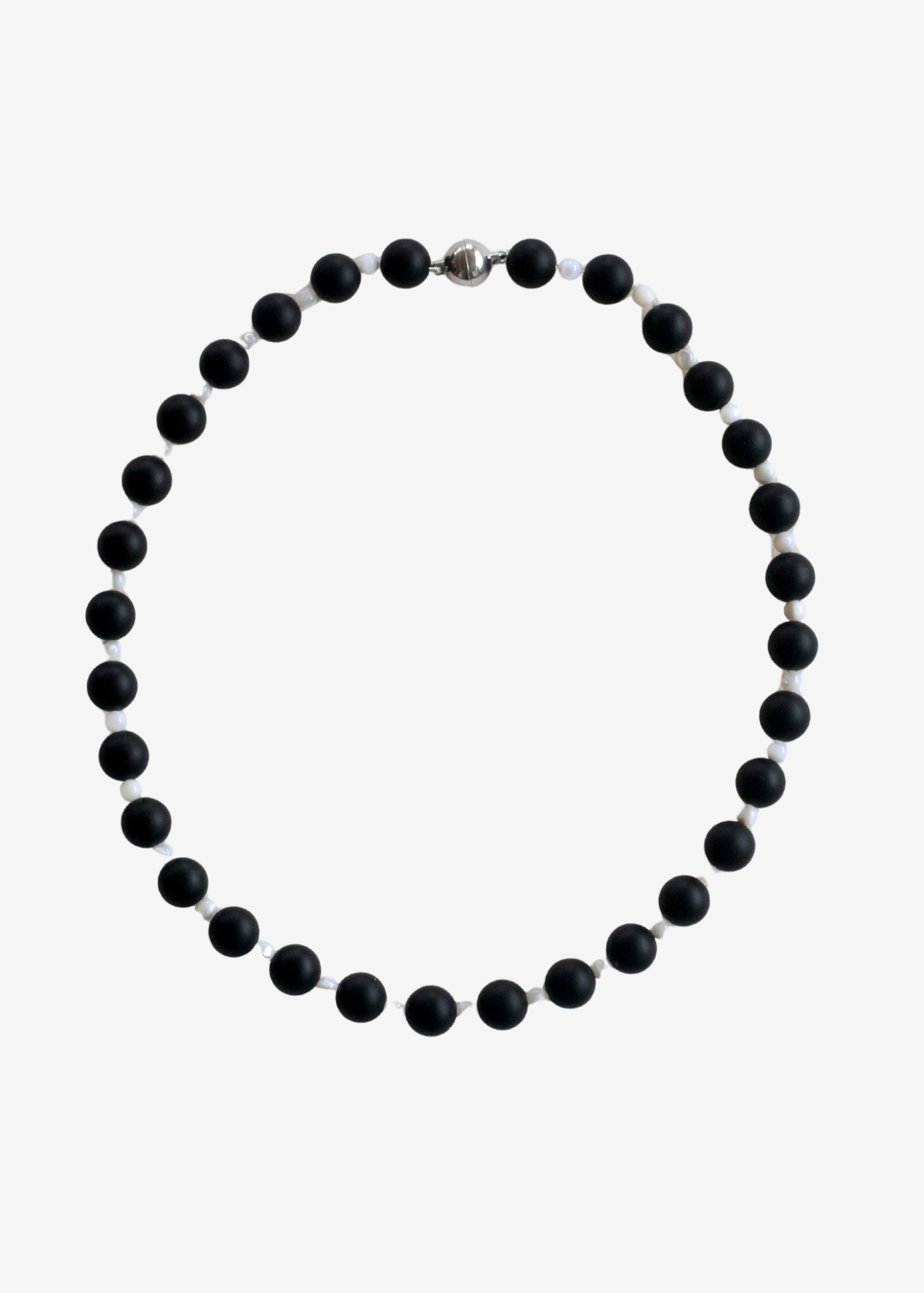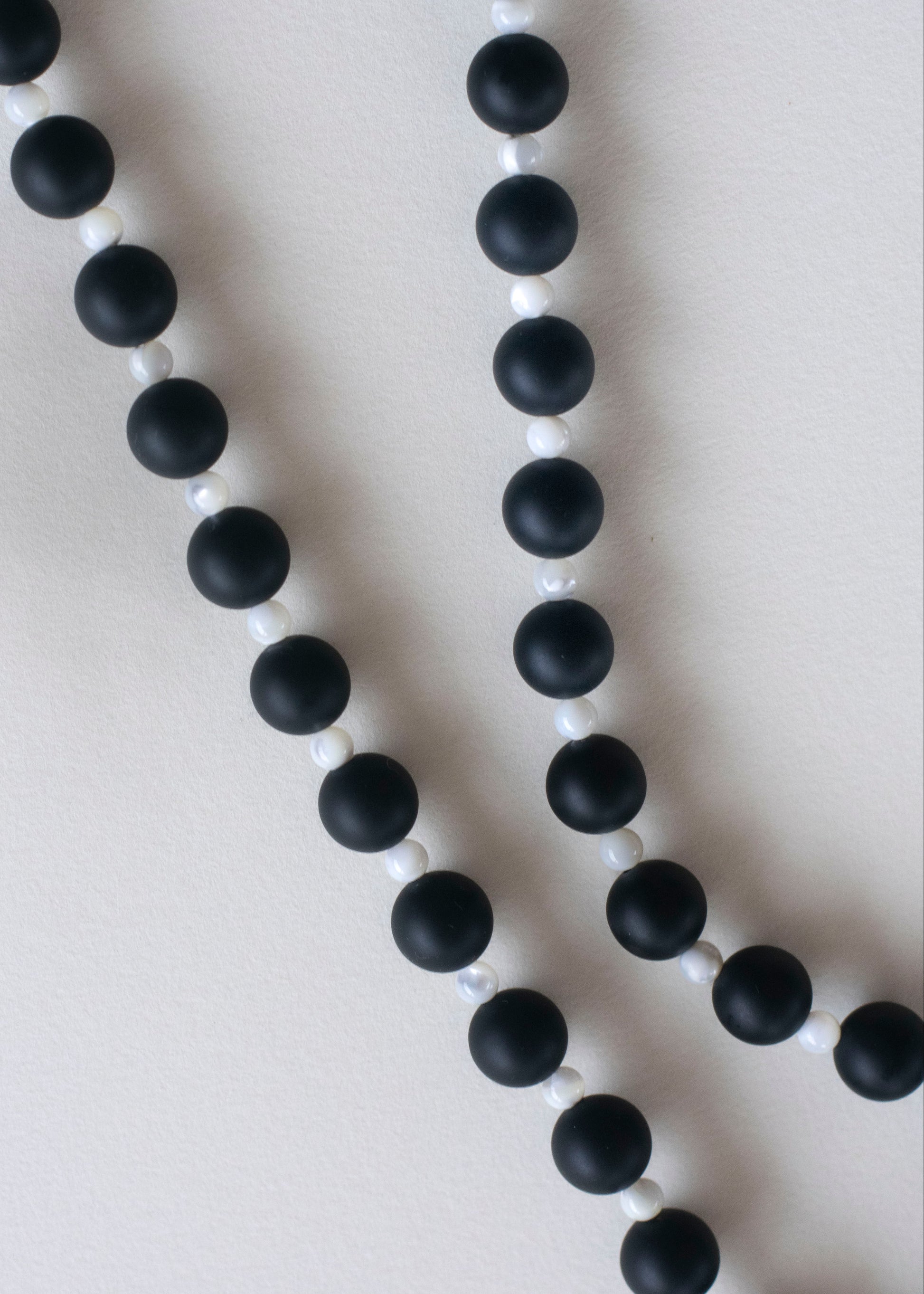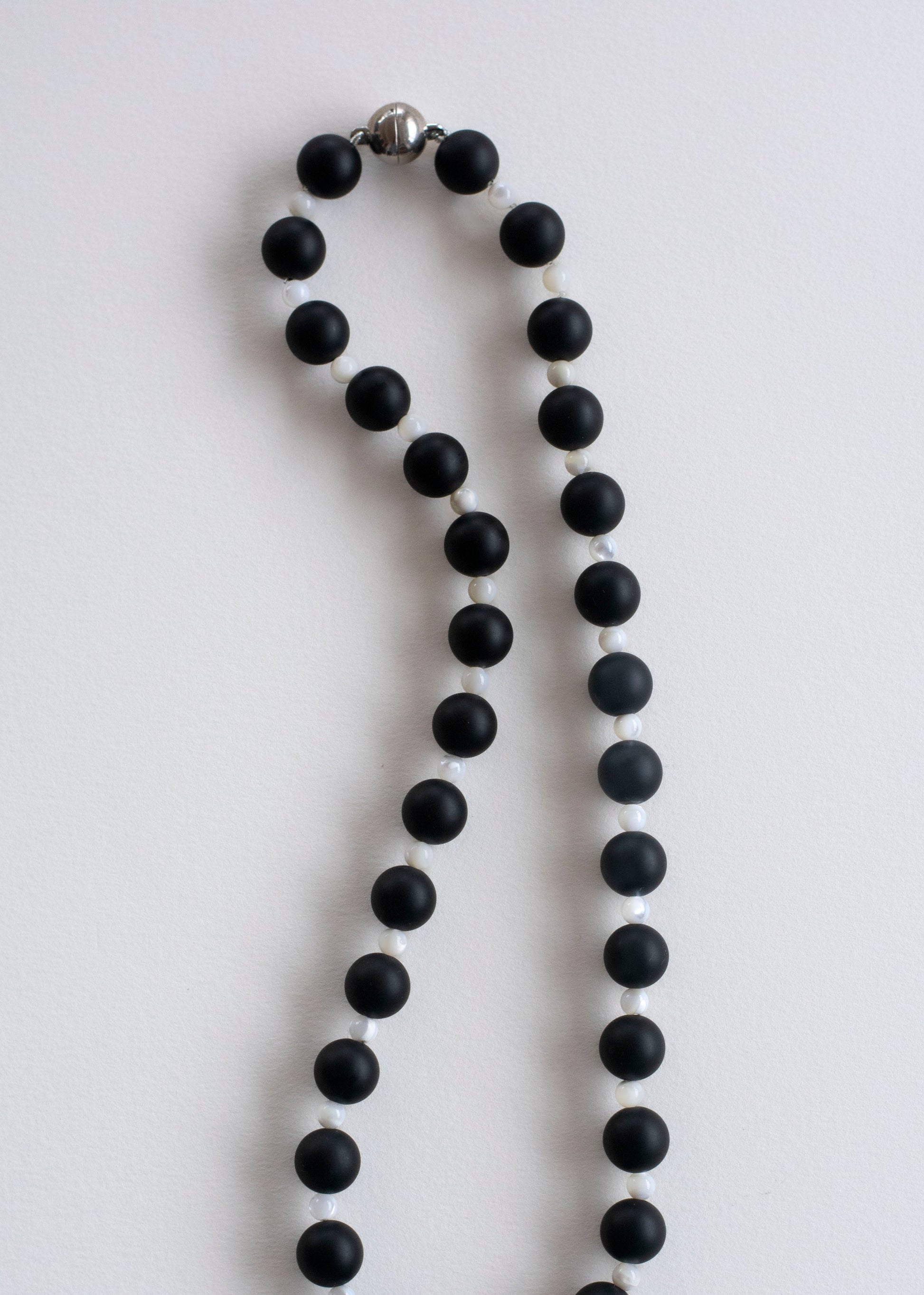 Single-stranded necklace made with alternating beads of matte black agate and mother of pearl.